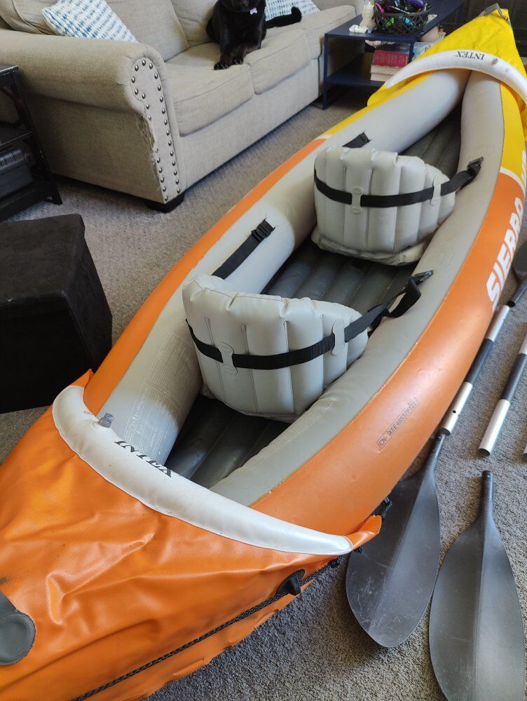 VenmoK2 Sierra Intex two person inflatable kayak. Works great. Comes with two paddles and the fin. Also comes with carrying case and air pump. Message with questions. $70 obo