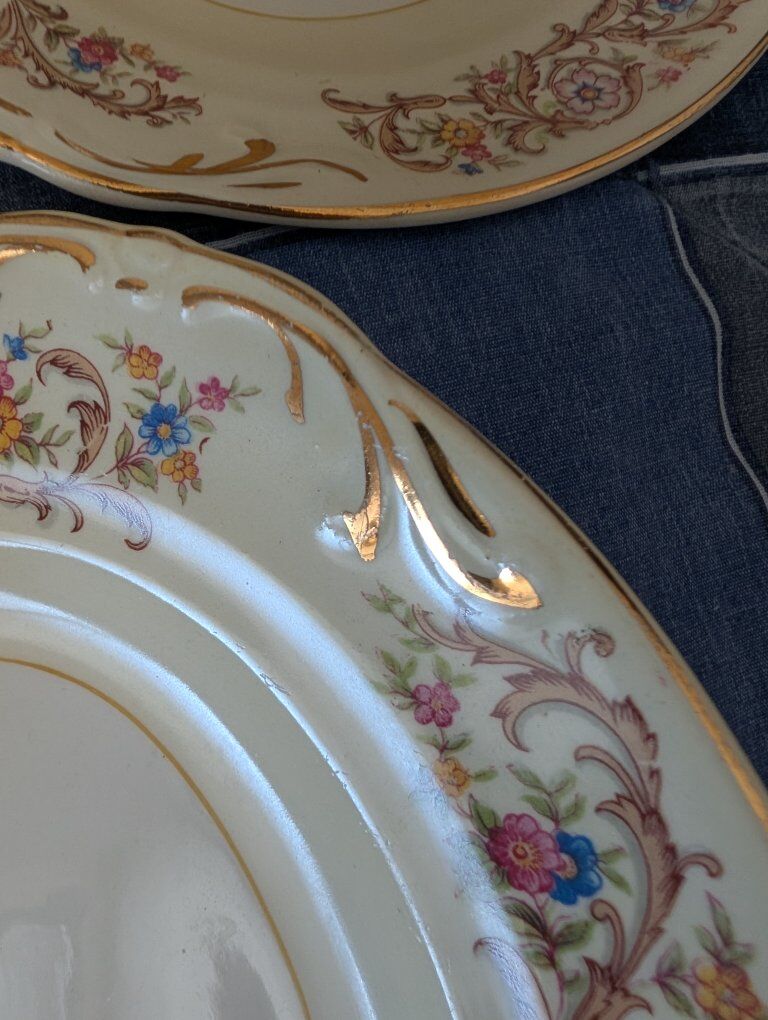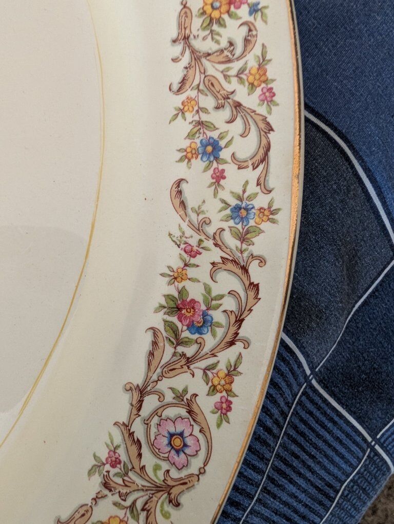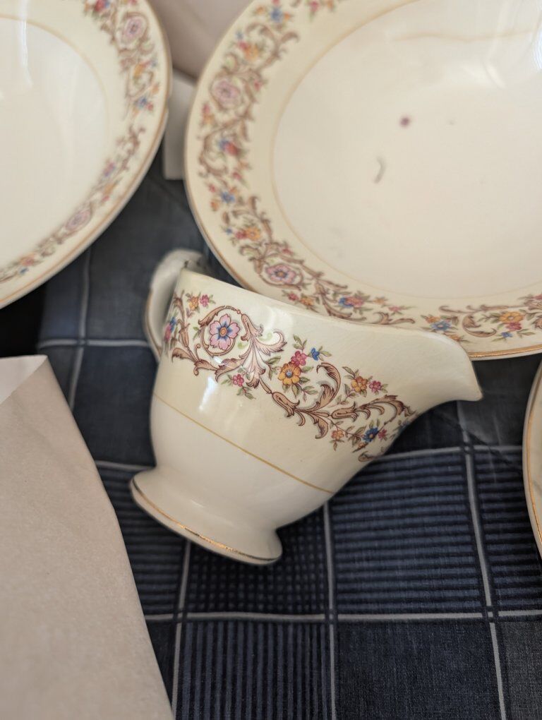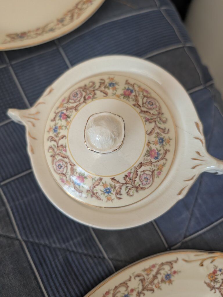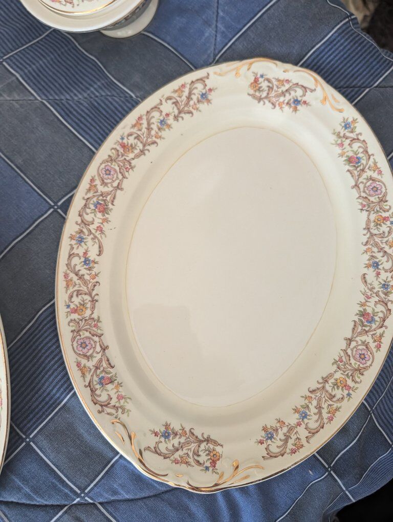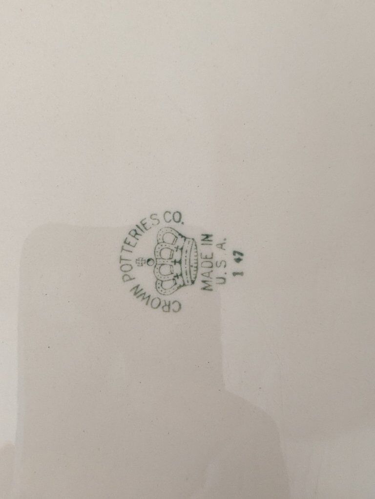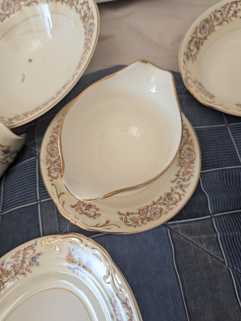 GooglePayDescription Beautiful vintage mid-century fine china by Crown Potteries Co., Made in USA. Elegant floral garland pattern with scrolling vines and real gold trim on an ivory ground. This is a matched set including both place settings and serving pieces, perfect for holiday entertaining, display, or replacement for existing sets. Included: • 2 Oval serving platters • 2 Serving bowls • 4 Large rimmed bowls • 7 Dinner plates • 7 Small bowls • 9 Tea cups • Creamer and sugar bowl • Gravy boat All pieces show typical vintage crazing in the glaze (normal for fine china of this era) but no cracks or repairs. Light surface wear from age and gentle use. Gold trim remains bright. This pattern is discontinued and increasingly difficult to find in complete groups with serving pieces. Carefully packed and shipped with full insurance