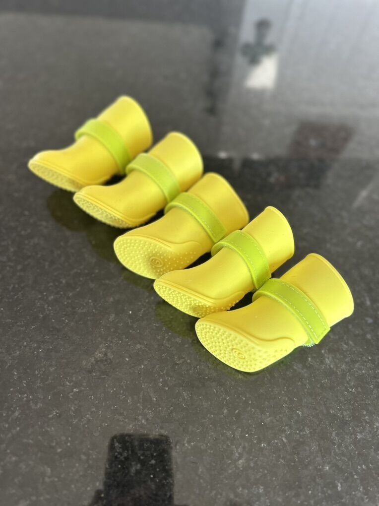 Soft, durable waterproof. Yellow. Size small. These fit my mini dachshund who’s around 10lbs. Adjustable Velcro straps. This allows for a tighter and snug fit. Each set has Four + 1. So there are 5 total.