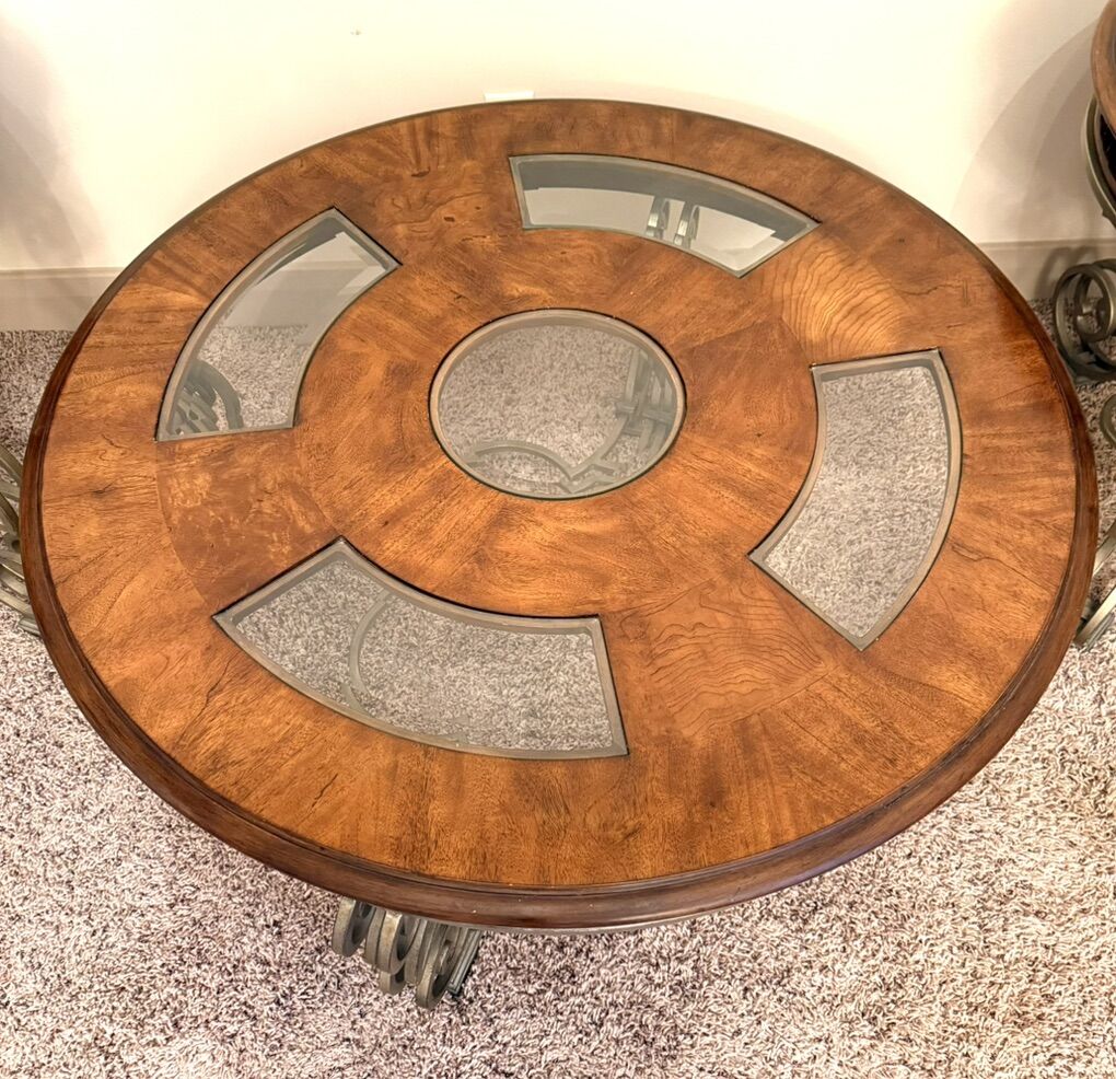 Solid wood coffee table with glass inserts and two (2) matching end tables. 3-piece set. Excellent condition!