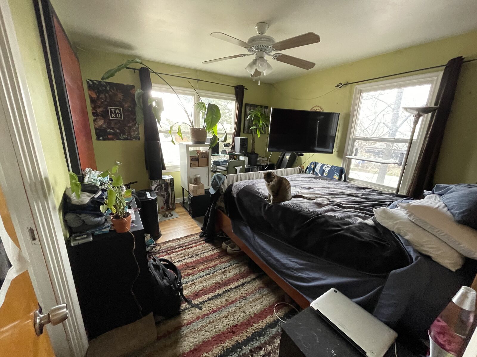 The room available is in the basement with two windows. It has a nice open-face closet and is a good size room with decent natural light.