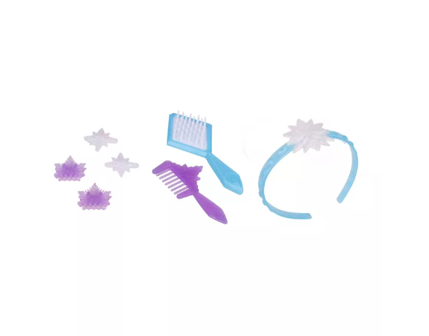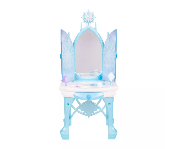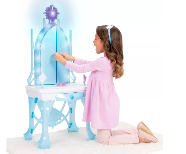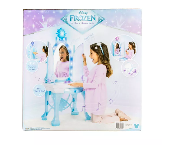Description Lights, mirrors, music! Your beauty kingdom awaits with the Icy Glow and Glamour Vanity, part of the Icy Magic Collection inspired by Disney's Frozen. Imagine you have Elsa's power to create and control ice and snow. Simply open the doors on your vanity and it lights up with blue "ice" while making crackly freezing sounds. With a push of a button, "Let it Go" will play as you get ready at the vanity! Use the brush, comb, and hair clips, then put on your headband to join the fun in your Icy Kingdom.