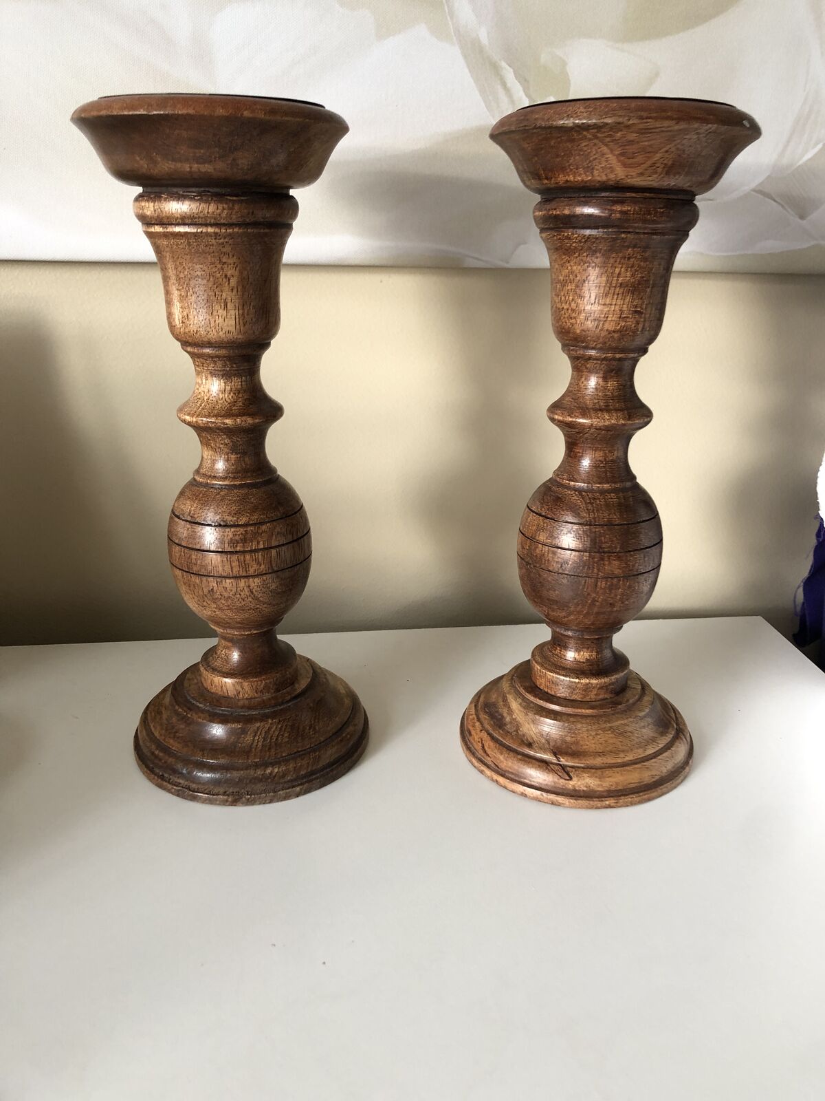 2 large wood candlesticks for 3 inch candles. 11.5 inches tall carved wood, made in India