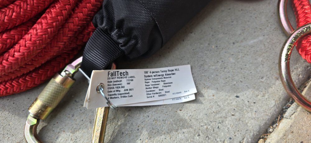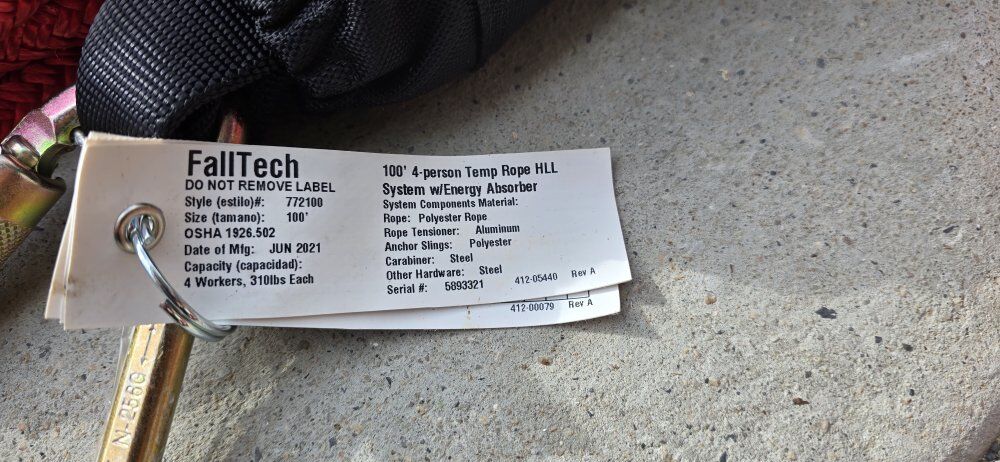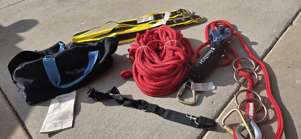 Falltech 100' rat line for a 4 man crew to have fall protection on roofing projects. Brand new! Great price! 1300 dollars at grainger for the same thing.