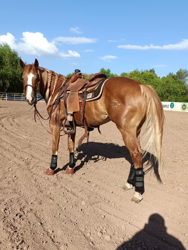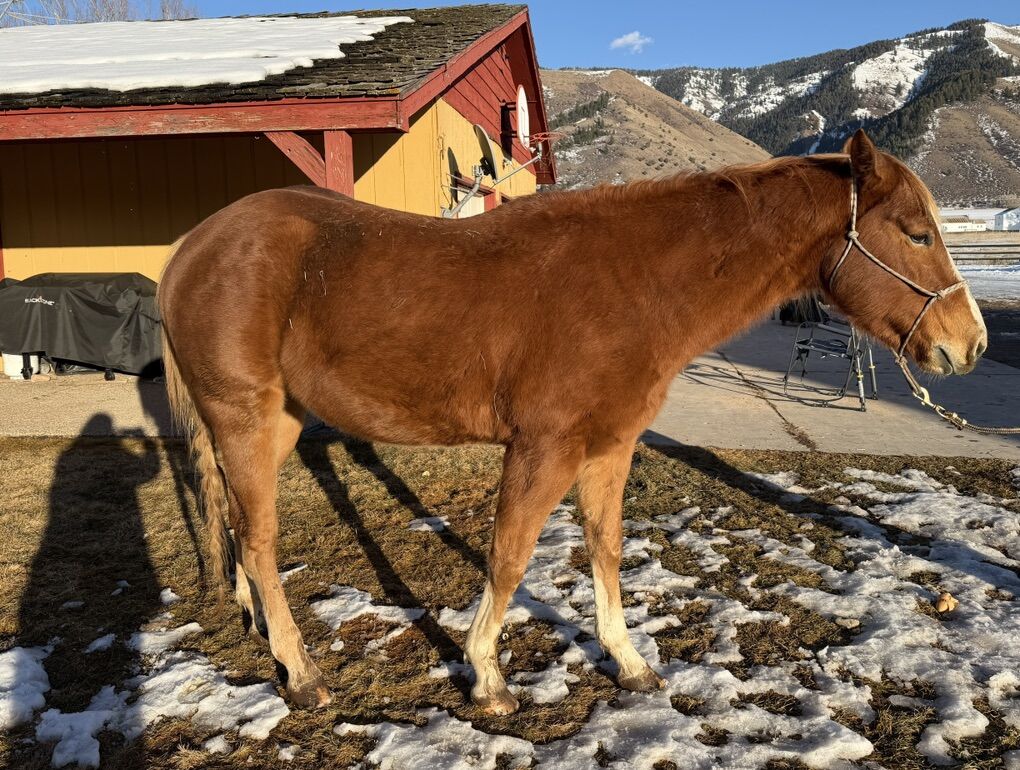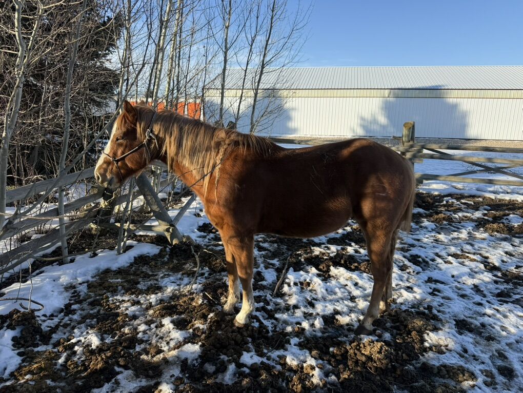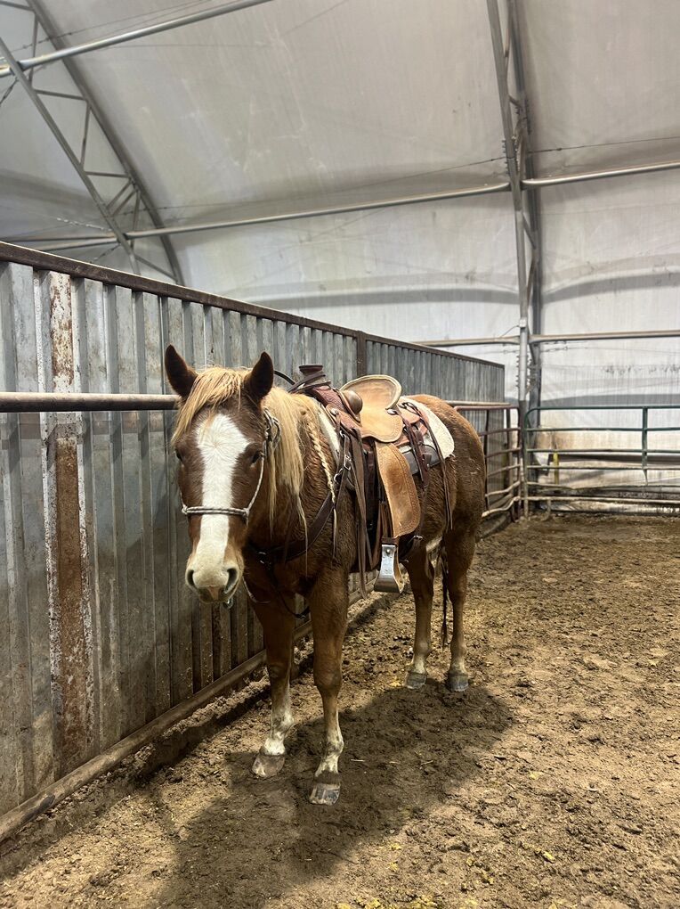 Mickey is a 5-year-old sorrel gelding with a flaxen mane and is a versatile ranch horse ready for finishing. He is on the back burner and needs to be used. There is an indoor arena close to try him out: