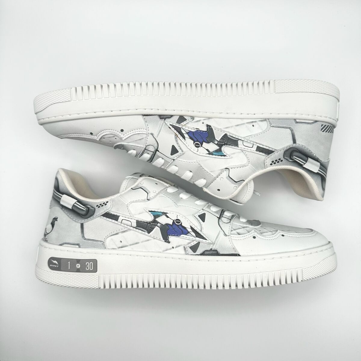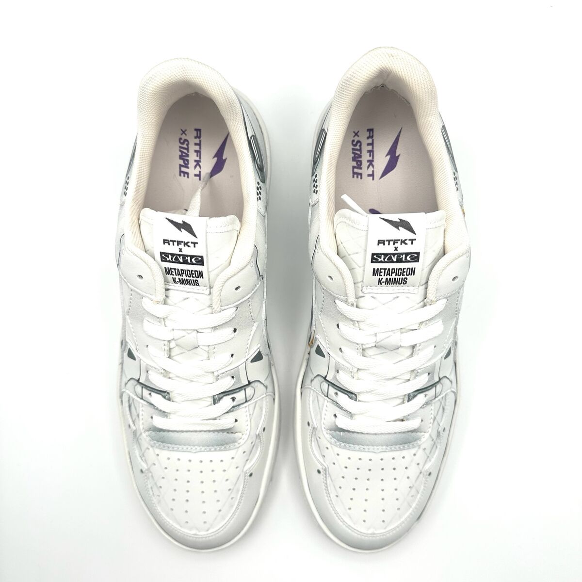 VenmoRTFKT x Staple MetaPigeon K Minos sneakers in white. These limited edition shoes feature a distinctive design with pigeon graphics and metallic accents. The insoles display the "RTFKT x STAPLE" collaboration logo. Perfect for a streetwear collection or a unique casual outing.