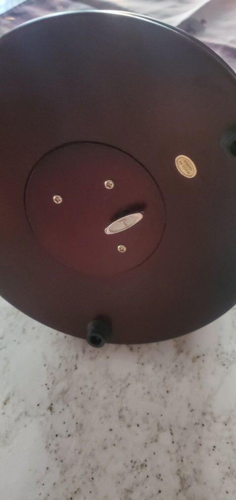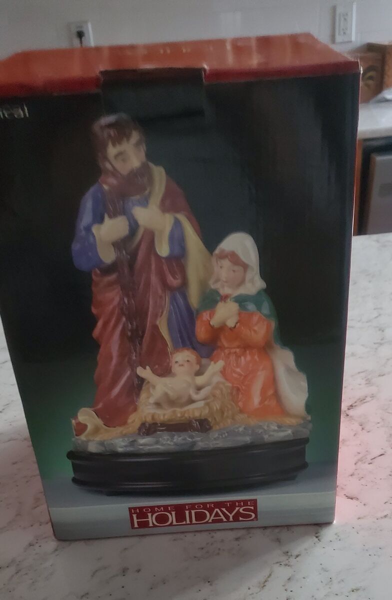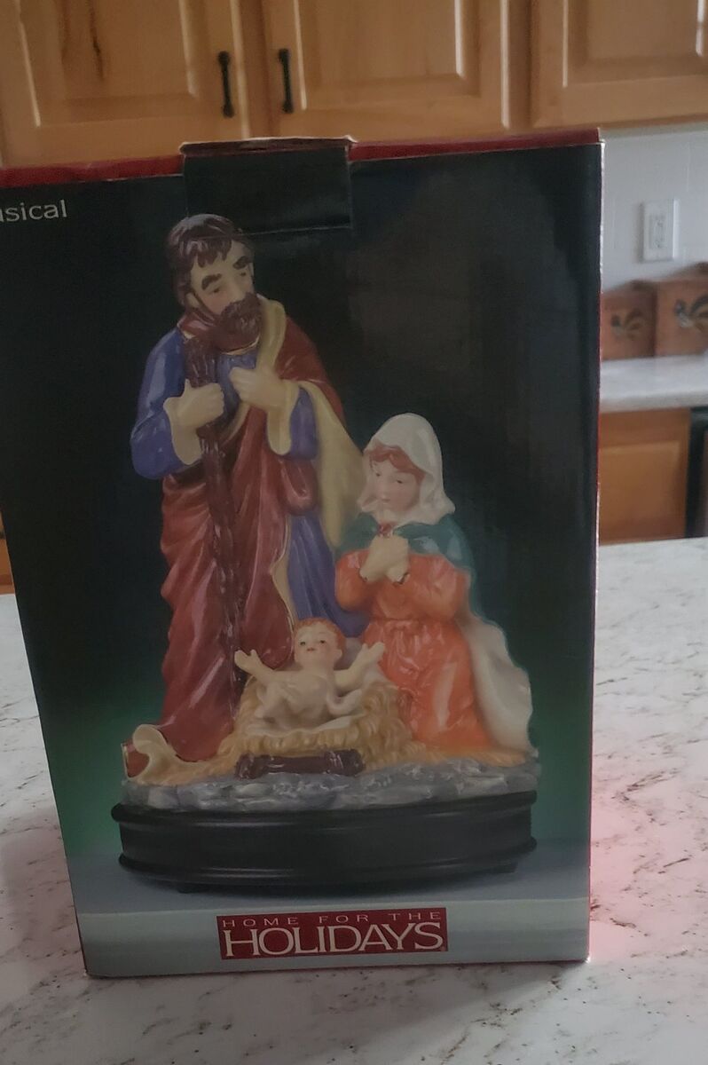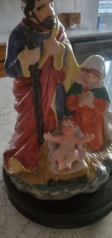 ceramic om wood base. plays :Silent Nihht". Base 7 1/2" across. 11" tall. No cracks, chips. Excellent condition