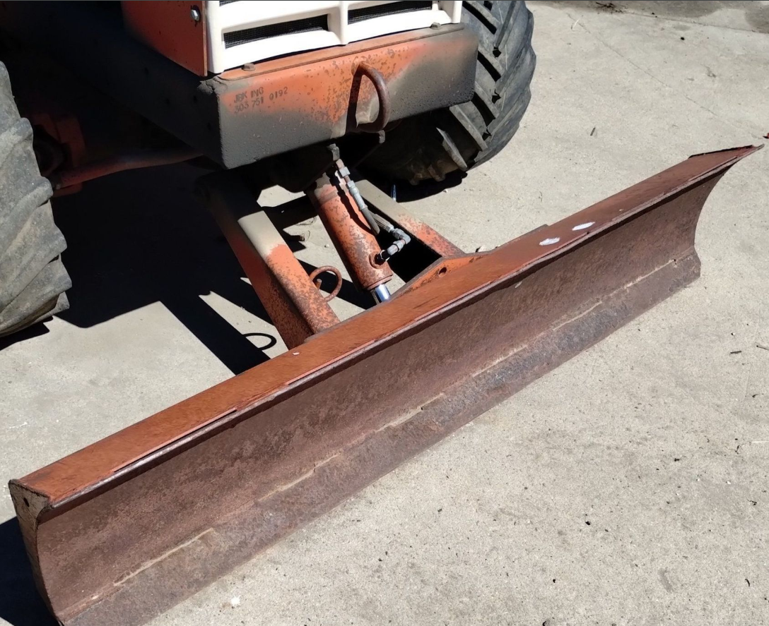 Machine shows approximately 1,811 hours. Open operator station with mechanical controls and analog gauges. Equipped with a front hydraulic backfill blade approximately 64 inches wide.