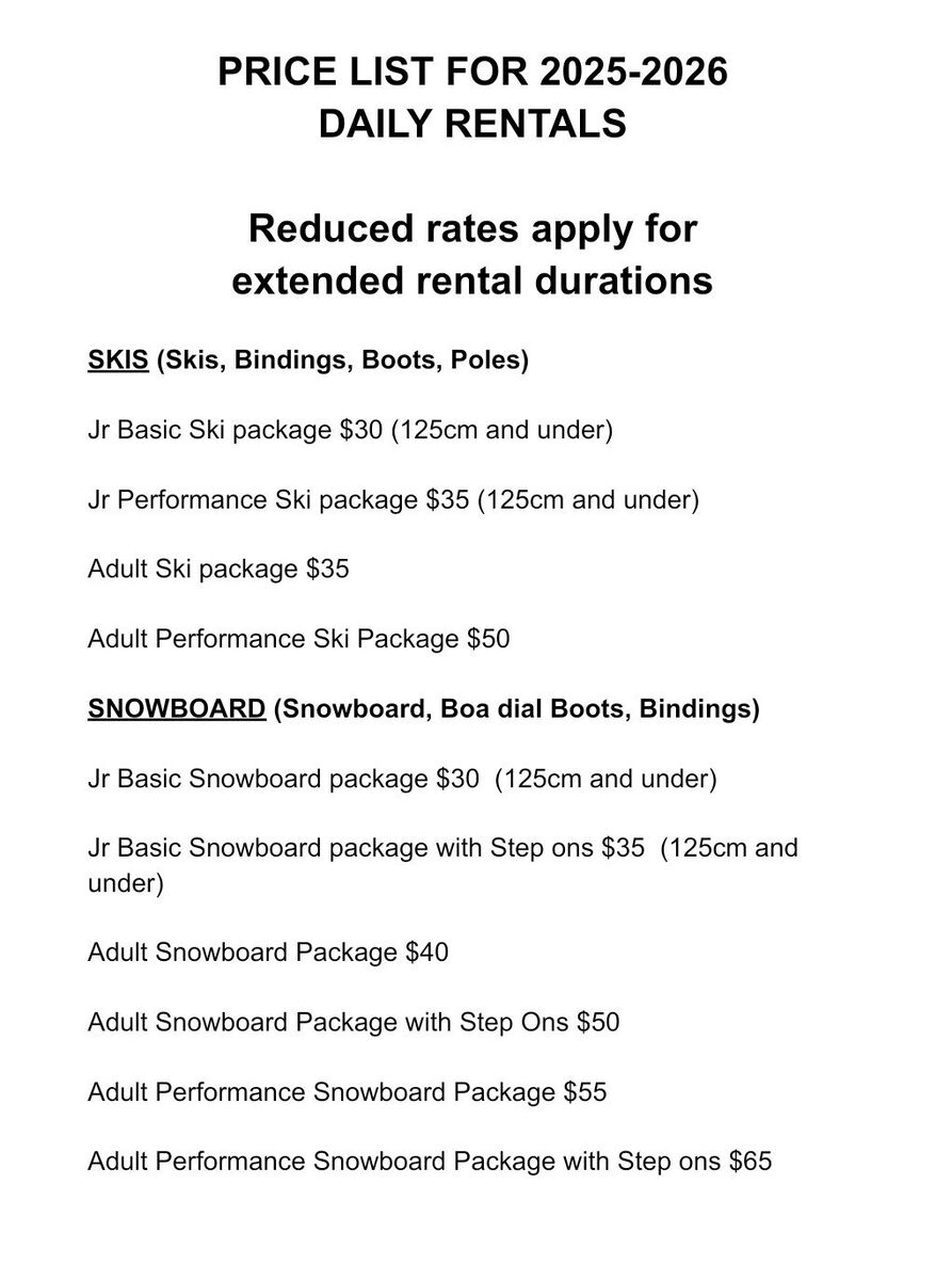 RENTALS SKI AND SNOWBOARD, kids to adults, Daily rentals starting at $30, Reduced rates apply to extended rental durations (weekends, weekly, monthly etc)