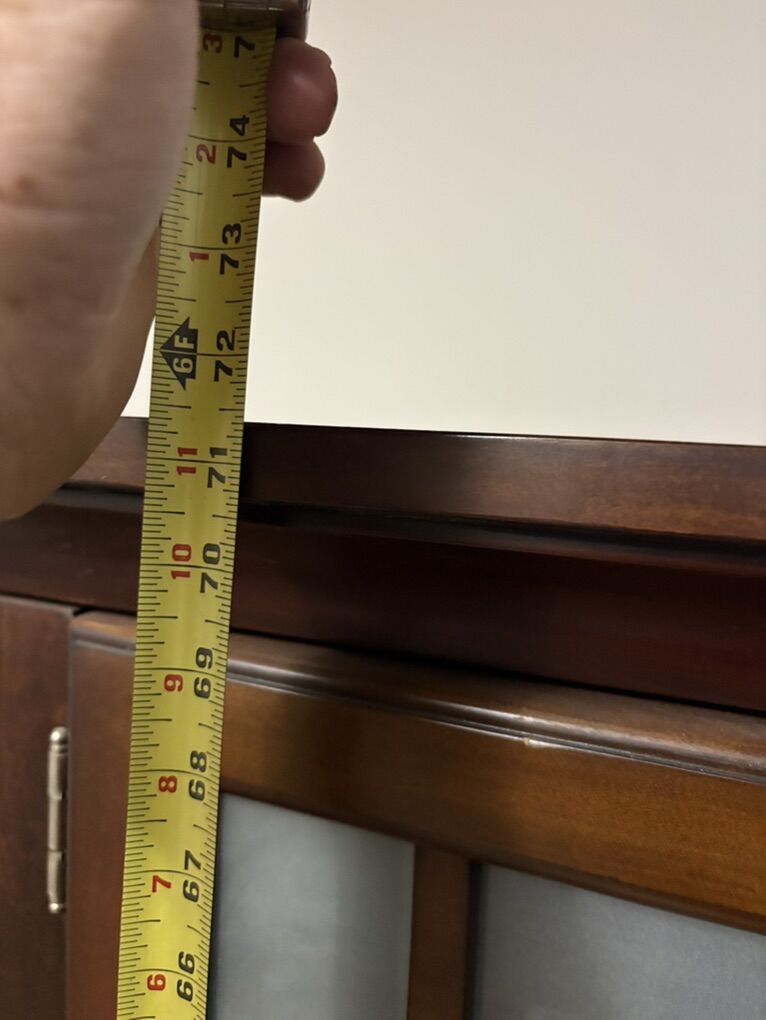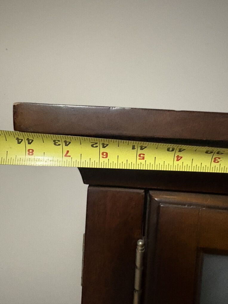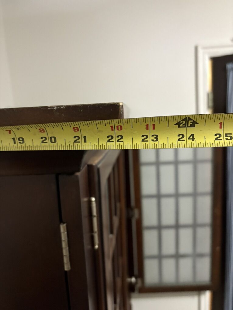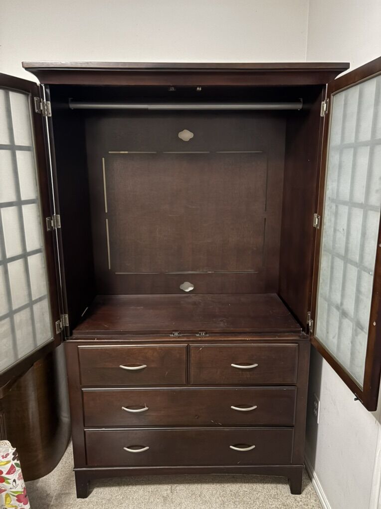 ZelleWe originally used this as a TV stand and it has a shelf that goes in the center on the top that is 28 to 31 inches from the bottom. Then we put it in a spare room to use as a wardrobe and put a bar in it for clothes, It fits clothes rather nicely. Three drawers on the bottom. The doors are a little warped, but they stay closed and there’s scratches after many ye of use.