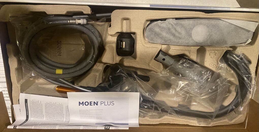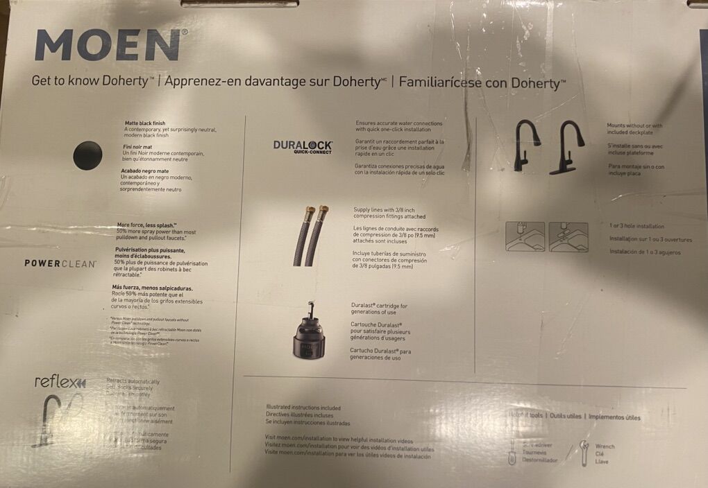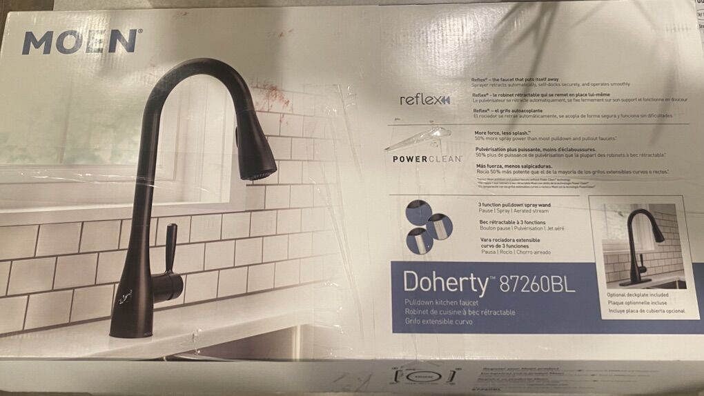VenmoMoen Single handle pull down kitchen faucet. Doherty model. New in open box. Matte black finish. Current retail price at Home Depot is $135 plus tax.