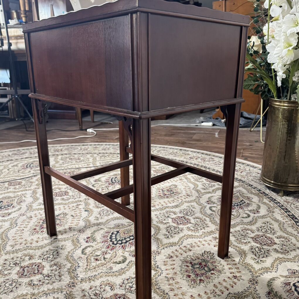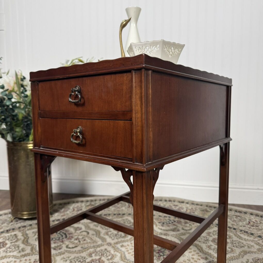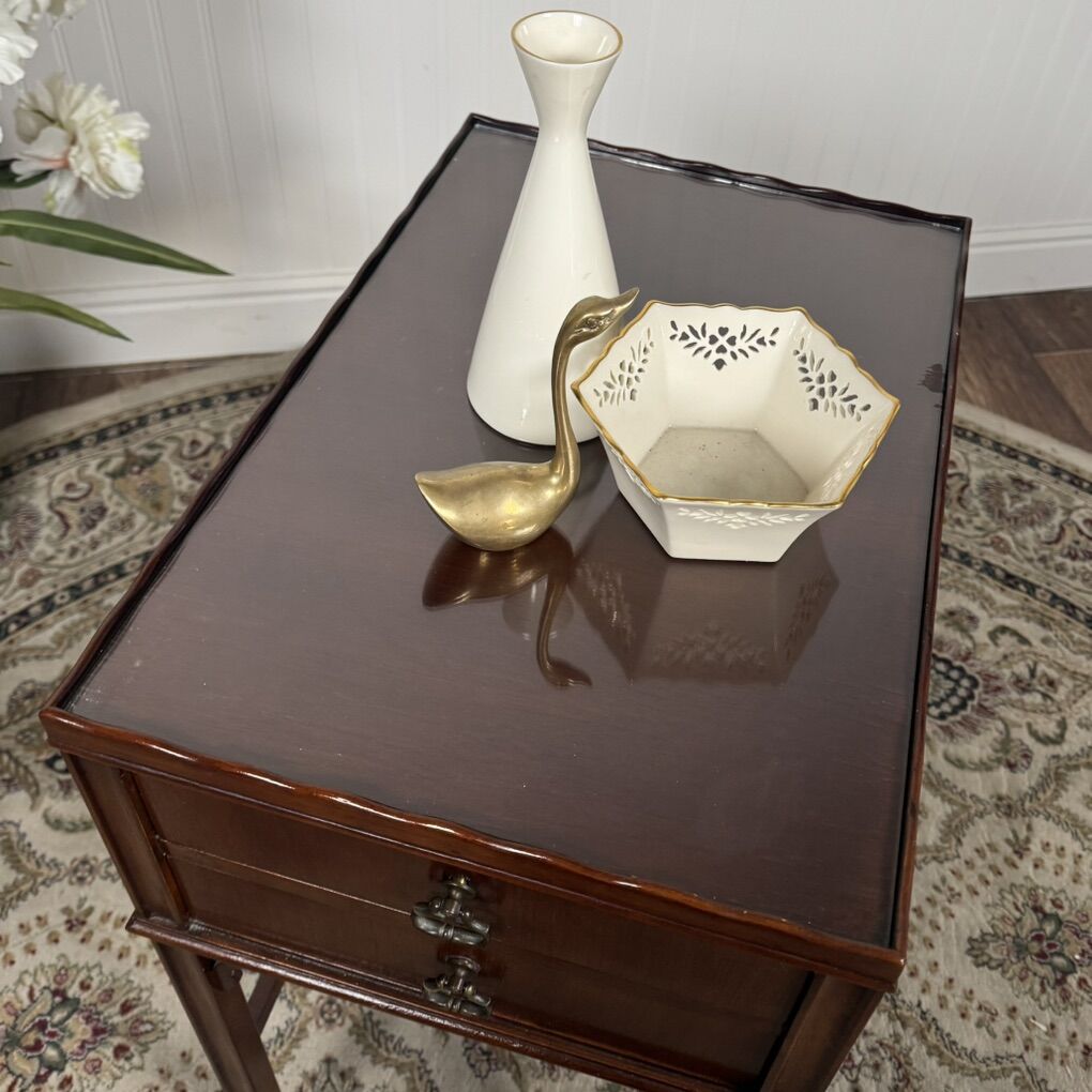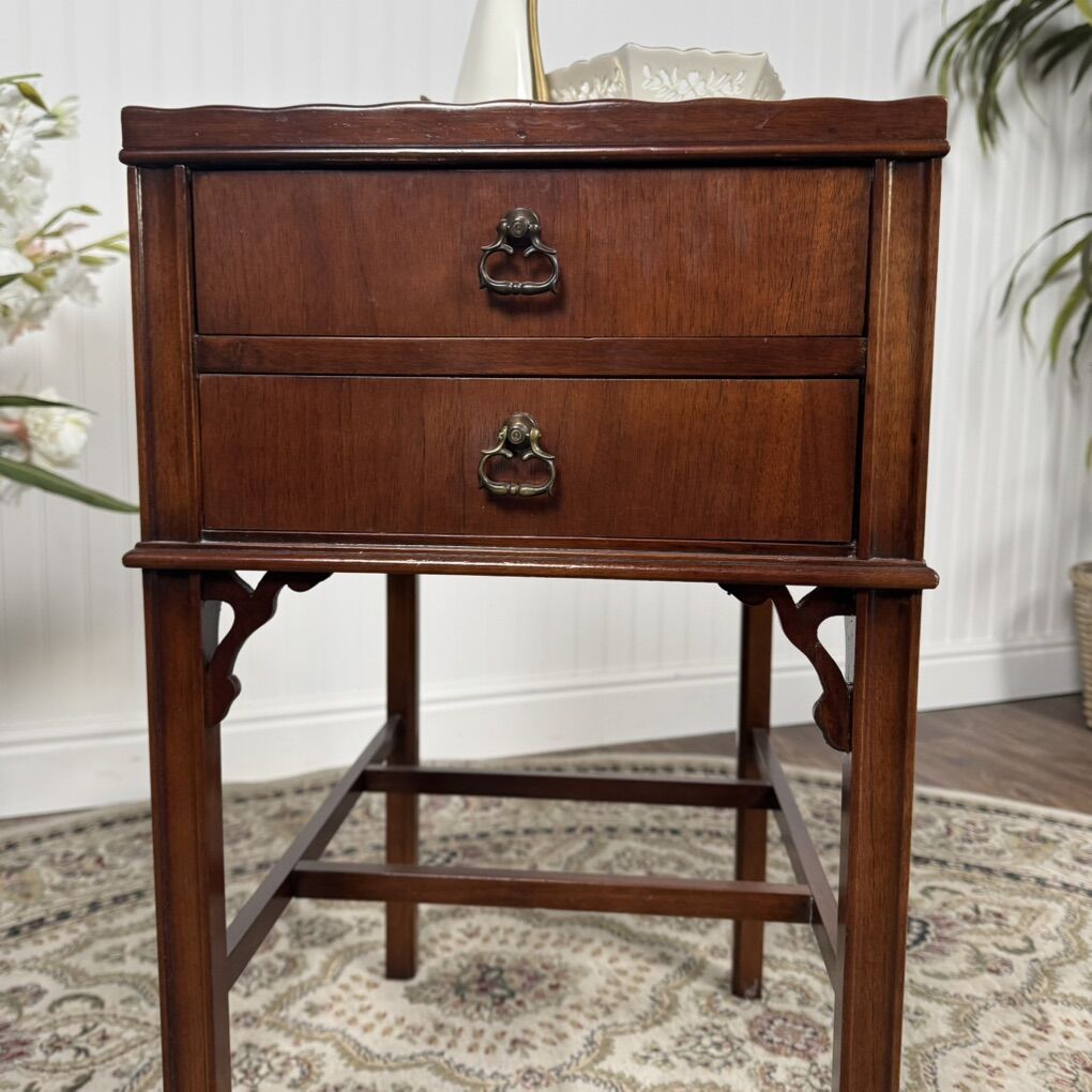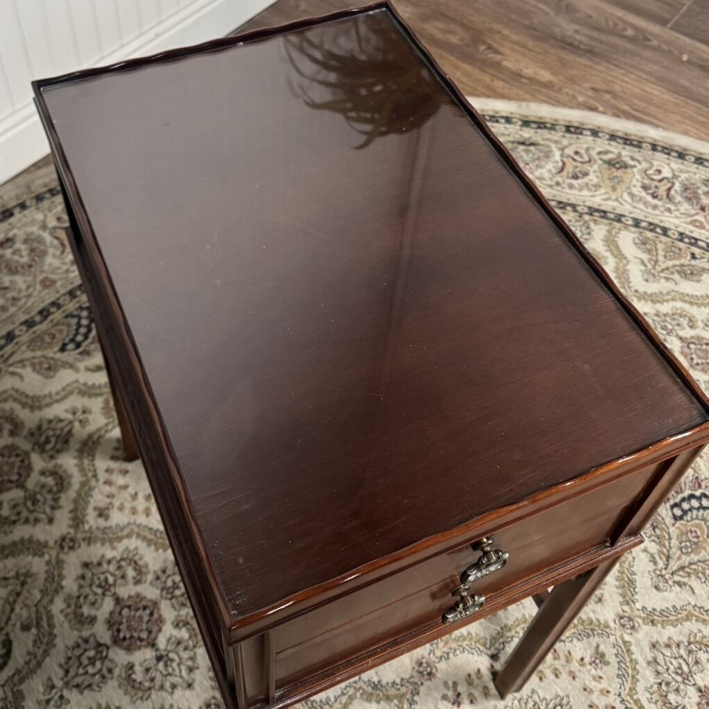 VenmoClassic solid wood end table featuring two dovetail drawers and elegant tapered legs. Beautiful warm wood tone with only minor signs of light, age-appropriate wear. Drawers are dovetailed, glide smoothly, and provide convenient storage for living room or bedside use.