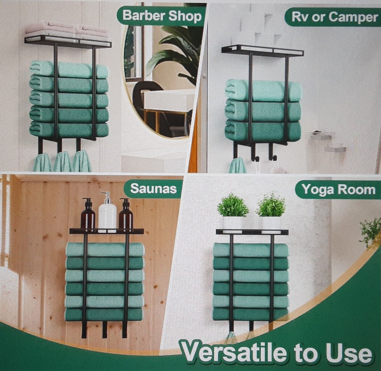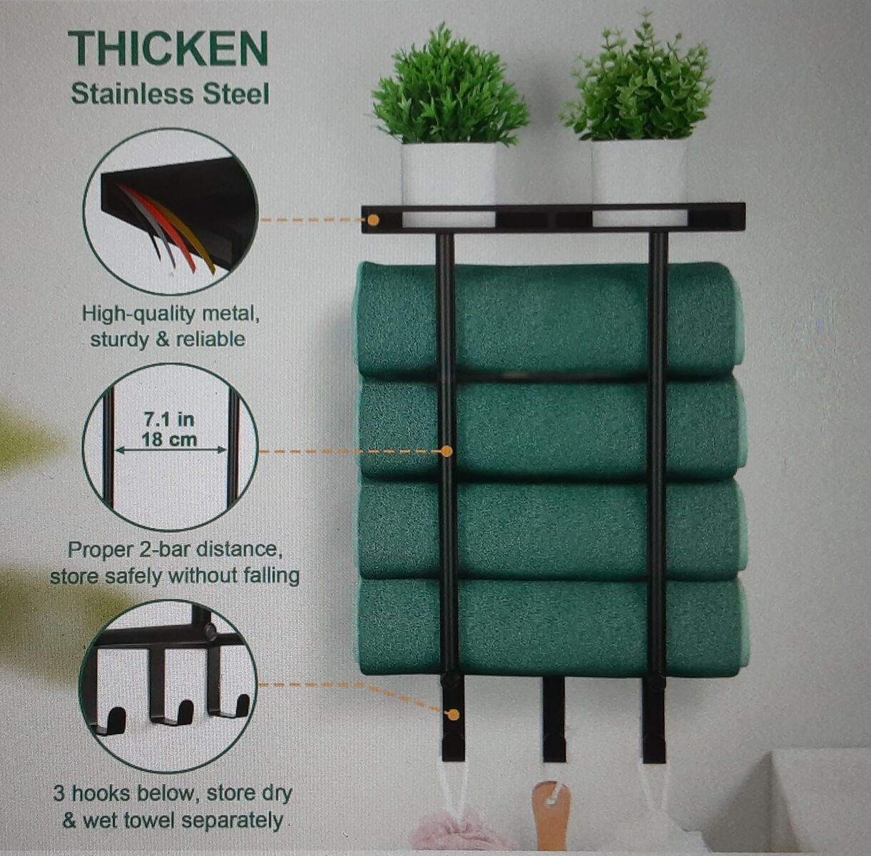 This New Wall Mounted Vertical Metal Towel Rack with Metal Shelf and 3 Hooks - Rolled Towels Holder and Bath Storage Organizer Is Still Packed In The Original Box.
