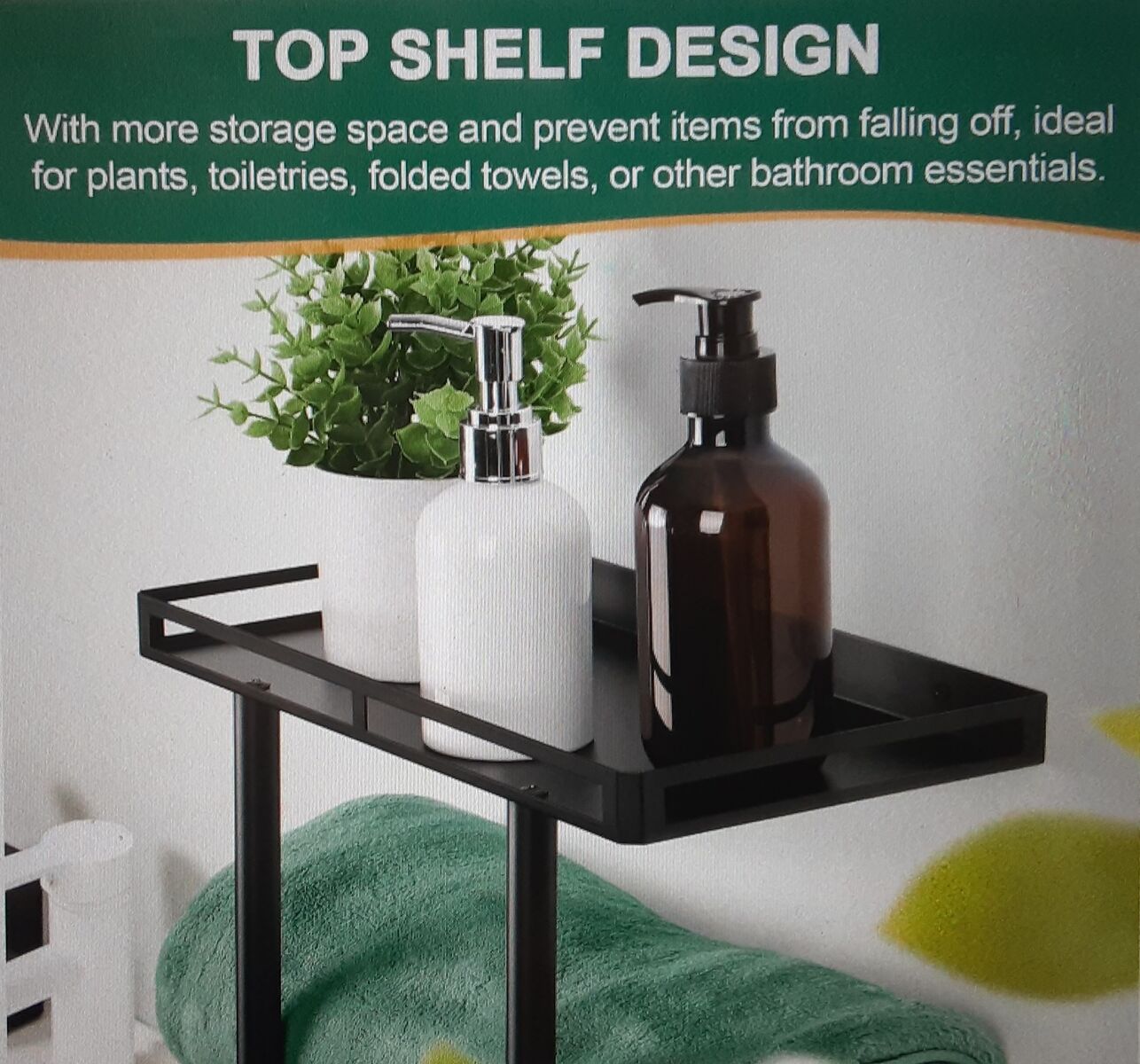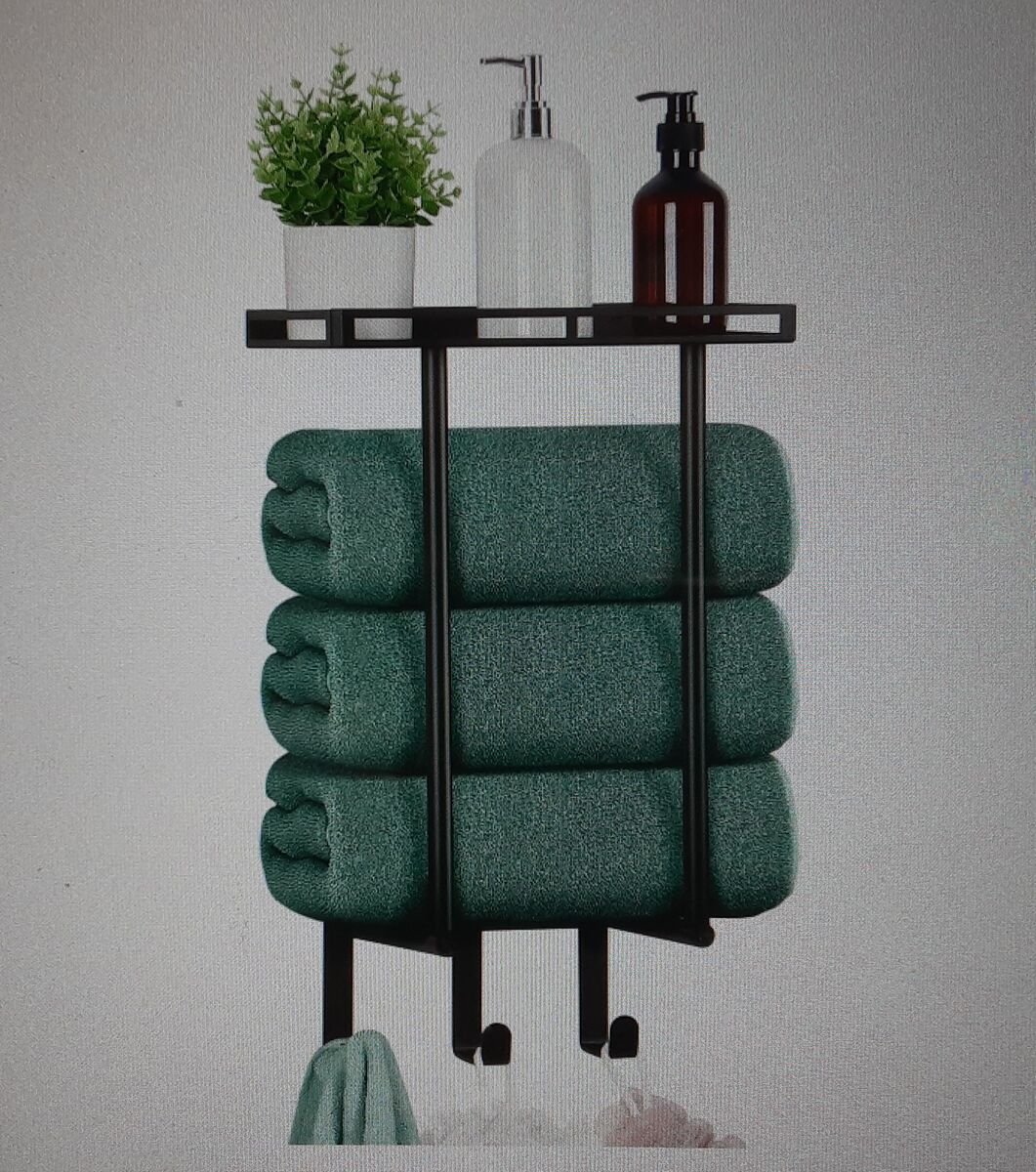 This Is A Brand New Wall Mounted Vertical Metal Towel Rack with Metal Shelf and 3 Hooks - Rolled Towels Holder and Bath Storage Organizer - Black Matte Finish - From HOMIKIT.