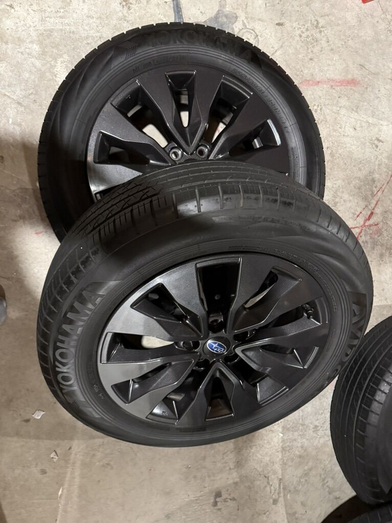 VenmoSubaru Outback Onyx wheels with Yokohama tires Includes four wheels with tires mounted/balanced and OEM TPMS sensors Wheels/tires have 9000 miles on them with no abnormal wear One wheel has small blemish from road debris, no curb rash on any wheels see photos TPMS sensors all functional