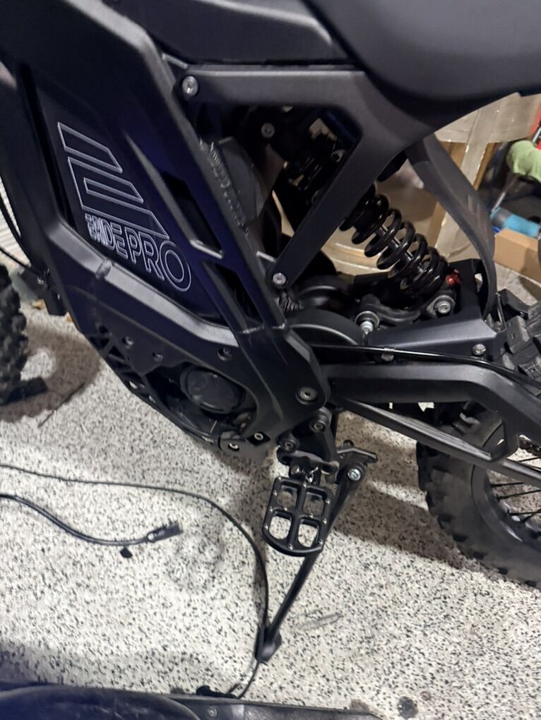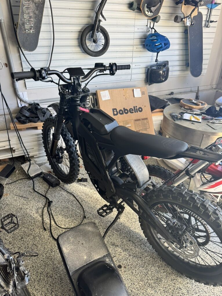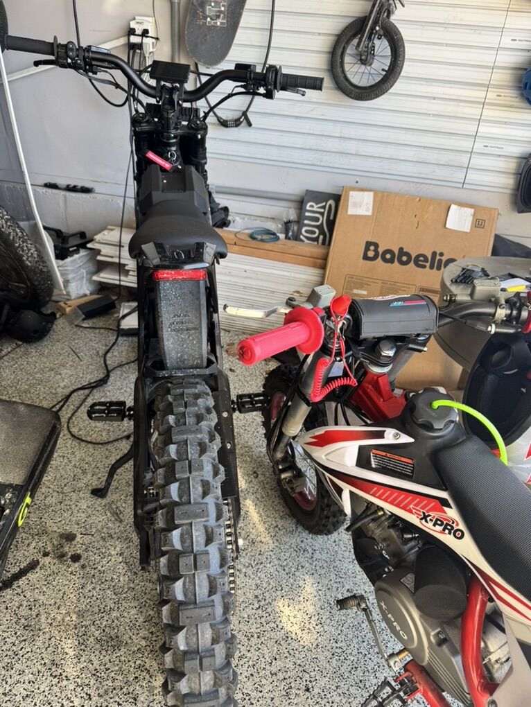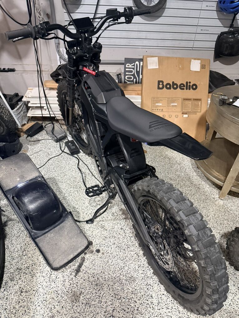 No trades. Introducing the all-new E Ride Pro SR – the most powerful and longest range. The E Ride Pro SR was engineered for those who demand power, precision, and top-tier performance. With 25kw of power, the E-Ride Pro SR offers jaw-dropping acceleration and an estimated top speed of 70 MPH! Bottom line, this is one of the most powerful electric bikes on the market. The 72V 50Ah battery can achieve well over 50 miles on a single charge. The Bluetooth-enabled controller lets you fine-tune your ride via a smartphone app, giving you full control over speed, torque, and other key performance parameters. Durability is at the core of the E Ride Pro SR with a reinforced frame, subframe, and swing arm. The widened drive belt pulley with mud drainage grooves allows the bike to perform flawlessly even in muddy conditions. The regenerative braking system ensures superior stopping power while recycling energy back to the battery. Additionally, the long seat and CNC foot pegs offer all-day comfort, making this bike perfect for extended adventures. The E Ride Pro SR comes equipped with 19-inch front and 18-inch rear off-road tires, providing excellent traction on dirt. If street riding is more your style, optional baby fat tires can be swapped in for urban performance. With a retail price of $6,499, the E Ride Pro SR delivers unmatched power, precision, and value for electric off-road enthusiasts. Key features of the E Ride Pro SR: Peak Motor Power: 25kW, offering aggressive acceleration and high-end performance. Battery: 72V 50Ah (3600Wh), providing long-range endurance for extended rides. Bluetooth-Enabled Controller: Customizable settings via smartphone for performance tuning. Direct Mount Stem: Stock feature for enhanced stability and control. Reinforced Frame & Swing Arm: Built tough to handle demanding off-road conditions. Drive Belt Pulley: Widened 22mm pulley with mud drainage grooves for optimized performance in muddy terrains. Heavy-Duty Drive Belt: Engineered for resilience and strength during intense rides. Regenerative Braking: Converts braking energy back to the battery for extended range. Long Seat: Designed for comfort during long-distance rides. Off-Road Tires: 19-inch front and 18-inch rear tires for dirt and gravel, with the option to upgrade to baby fat tires for street riding. E Ride Pro SR Specifications: • Acceleration: 0-30 MPH in 1.8 seconds • Top Speed: 62 MPH • Motor Power: 25kW Peak Power • Range: Up to 100 miles @ 15 MPH / 62 miles @ 25 MPH • Battery: 72V 50Ah (3600Wh) • Charge Time (20%-90%): 3.5 hours • Tire Size: Front 80/100-19; Rear 100/90-18 • Weight Limit: 302 lbs • Unit Weight: 183 lbs • Seat Height: 33.5 inches • Wheelbase: 49.6 inches • Ground Clearance: 10 inches • Frame: Reinforced frame & swing arm • Suspension: FastAce PRO V Suspension • Brakes: DOT4 hydraulic brakes (front) & Automatic Regenerative/Finger Regen brake (rear) 1 year manufacturer's warranty This bike is for off-road use only and is sold with the speed/power limited via a governor to comply with federal, state and local laws.Customers who unplug or bypass this restriction do so at their own risk and takes full responsibility for ensuring proper use of the product to comply with applicable laws in the region it is ridden. See Less Really great condition other than 150 gentle miles