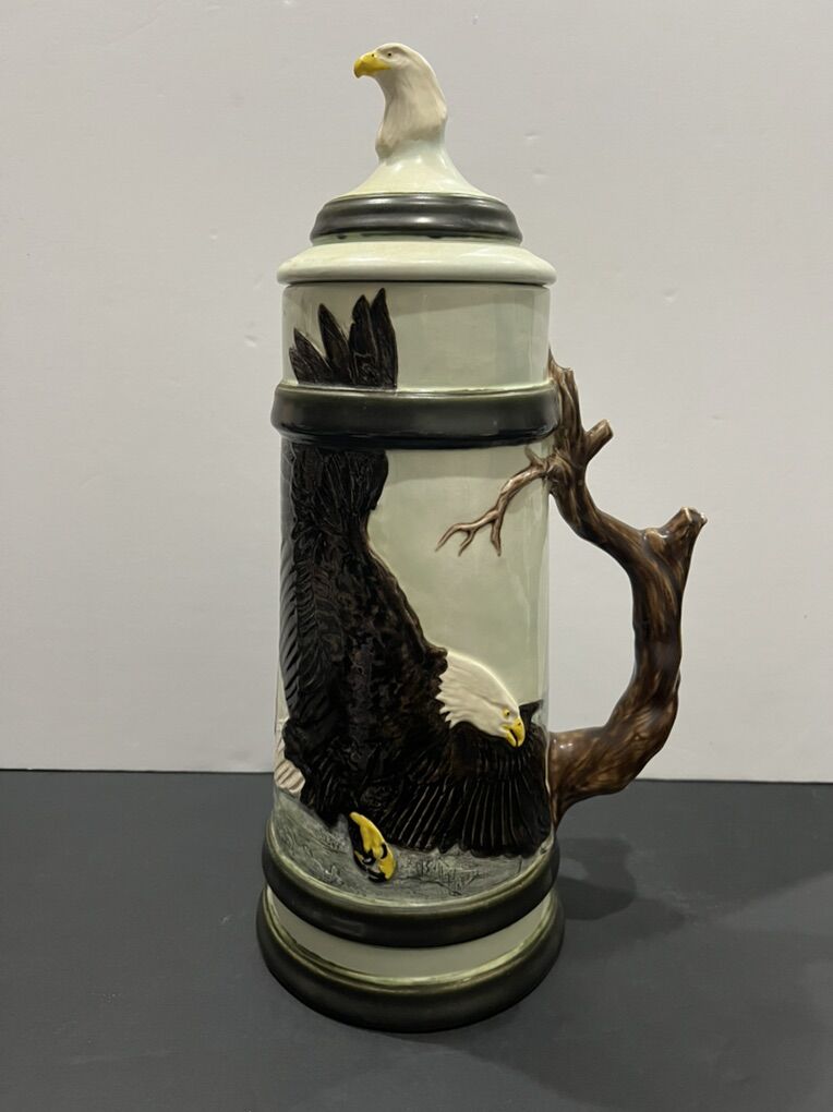VenmoVintage, hand-painted ceramic tankard or beer stein featuring a bald eagle motif. It is a collectible item, often referred to as an Eagle Stein. The design includes a detailed, raised-relief sculpture of a bald eagle perched on rocks with fish nearby. The stein has a unique handle sculpted to look like a tree branch. It stands approximately 16 inches tall.
