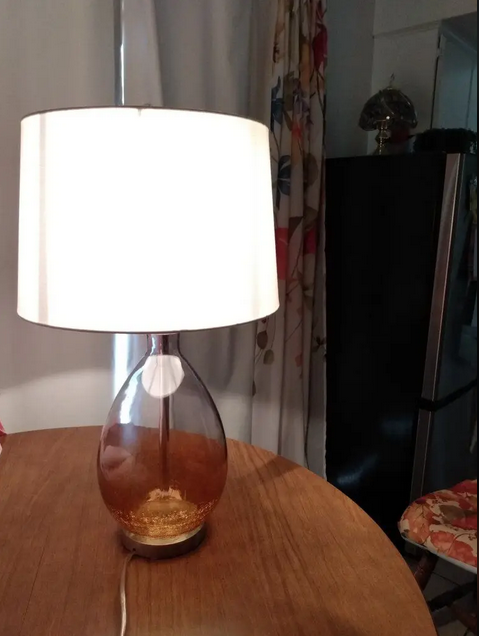 Set of 2 glass table lamps in good condition. Lamps are 26.5 inches tall. Orange gradient design accent on the bottom of the glass. One shade has a mark on it, otherwise the lamps are in great shape. At only $45 for the pair they are a great bargain. Pickup in Riverton, payment in cash .
