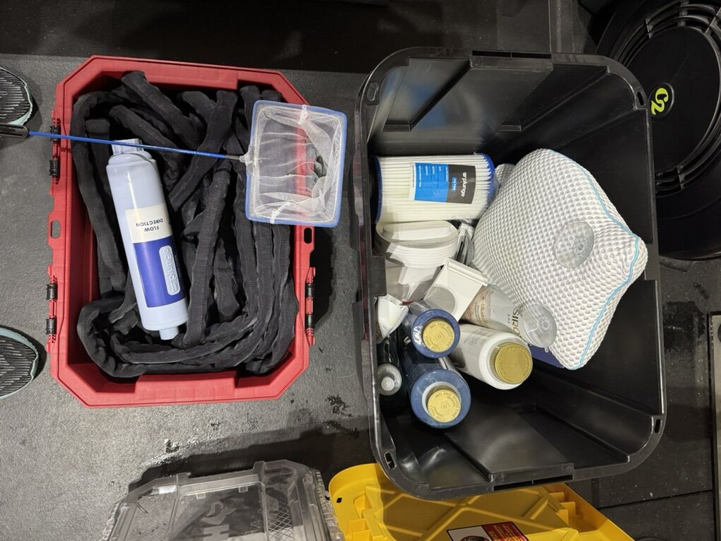Includes: Plunge Cover Extra filter Pillow Phone holder Hose filter to fill Skimmer Pillow Full set of chemicals Hose to drain.