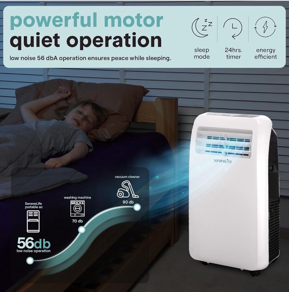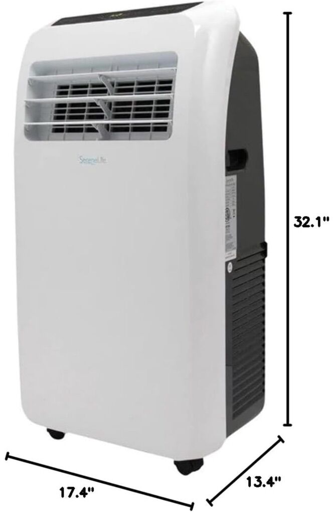 HANDY AND PORTABLE: The Serene Life Portable Air Conditioner System features a lightweight, handy, sleek body design intended to be used in the bedroom, living room, or garage at home or office. It features rolling wheels for easy portability.Controller type:Remote Control BUILT-IN DEHUMIDIFIER: you don’t only get the cooling effect of the portable AC but also helps reduce humidity levels, a huge financial and space saving! 4 OPERATING MODES: The compact floor AC indoor cooler conditioning unit features a simple electric plug in operation and has 4 modes - cooling, heating, dehumidifier, and fan. Also features automatic swing mode w/ moving wind vent for maximum air circulation REMOTE CONTROL: Features a digital touch button control panel which includes the power, mode, timer, temperature, and fan speed settings. Other functions such as unit selector (°C/°F), sleep key can be adjusted using the included remote control GREAT FOR ALL YEAR ROUND: With 10, 000 BTU (ASHRAE) / 6,000 BTU (SACC) cooling power and 9, 000 BTU Heating power, this is the best option to save space and money. The cold air can cover a room up to 450+ sq. ft. , Air flow is rated at 290 m3/hr., moisture removal/dehumidifier at 15 liters/hr. w/ an operating noise level of only 52-56 dBa