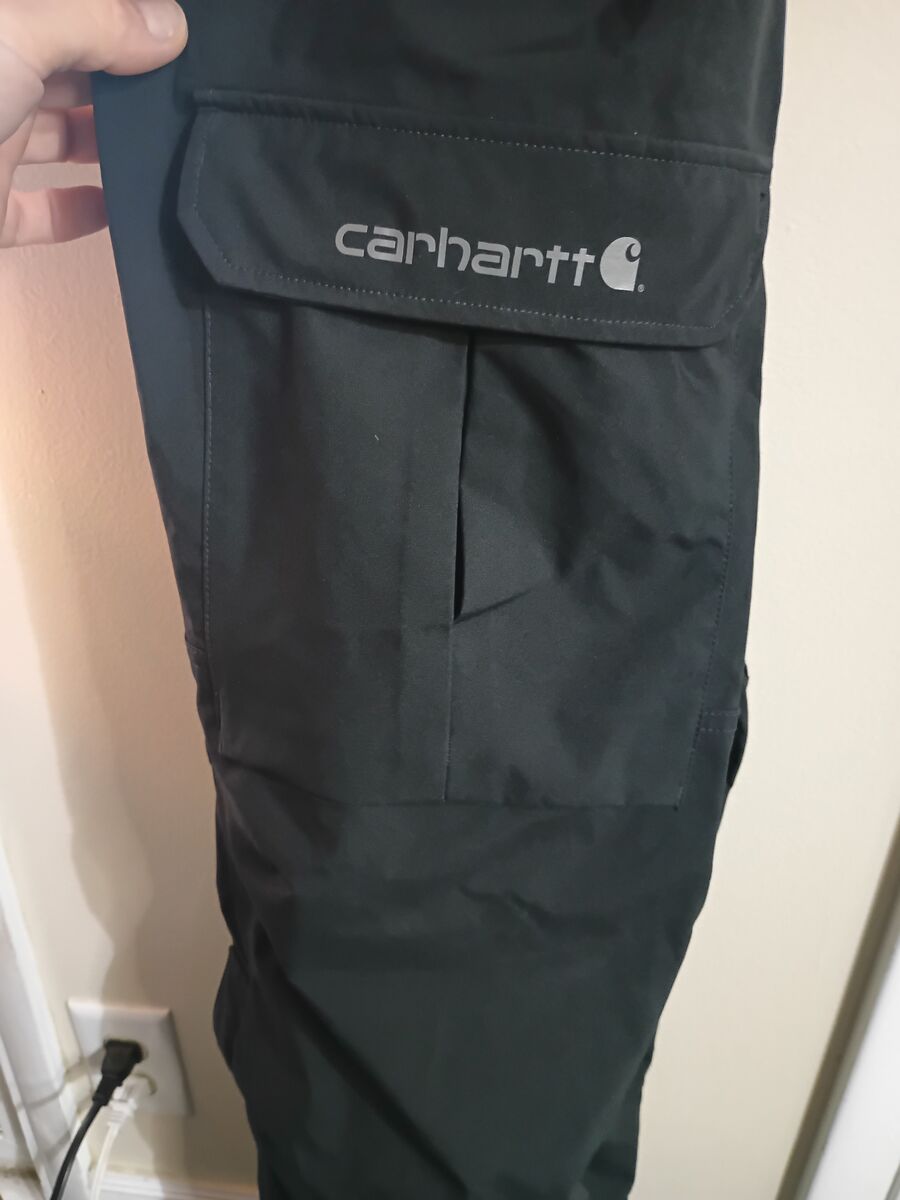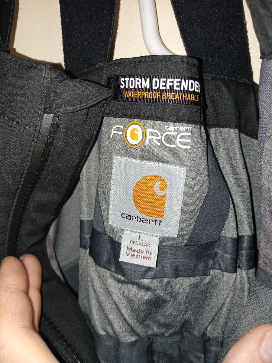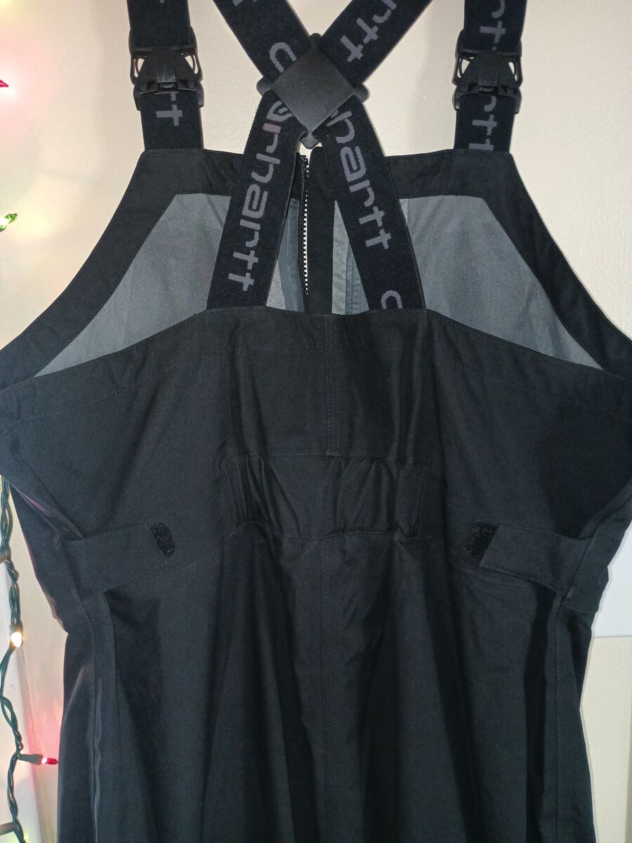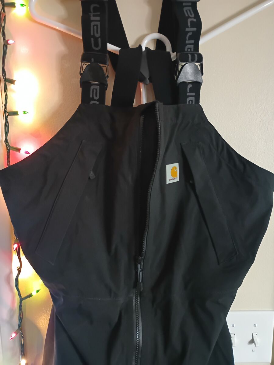 Some slight discoloration or scuffing inside left leg of pant, otherwise these Carhartt bibs are in like new condition.
