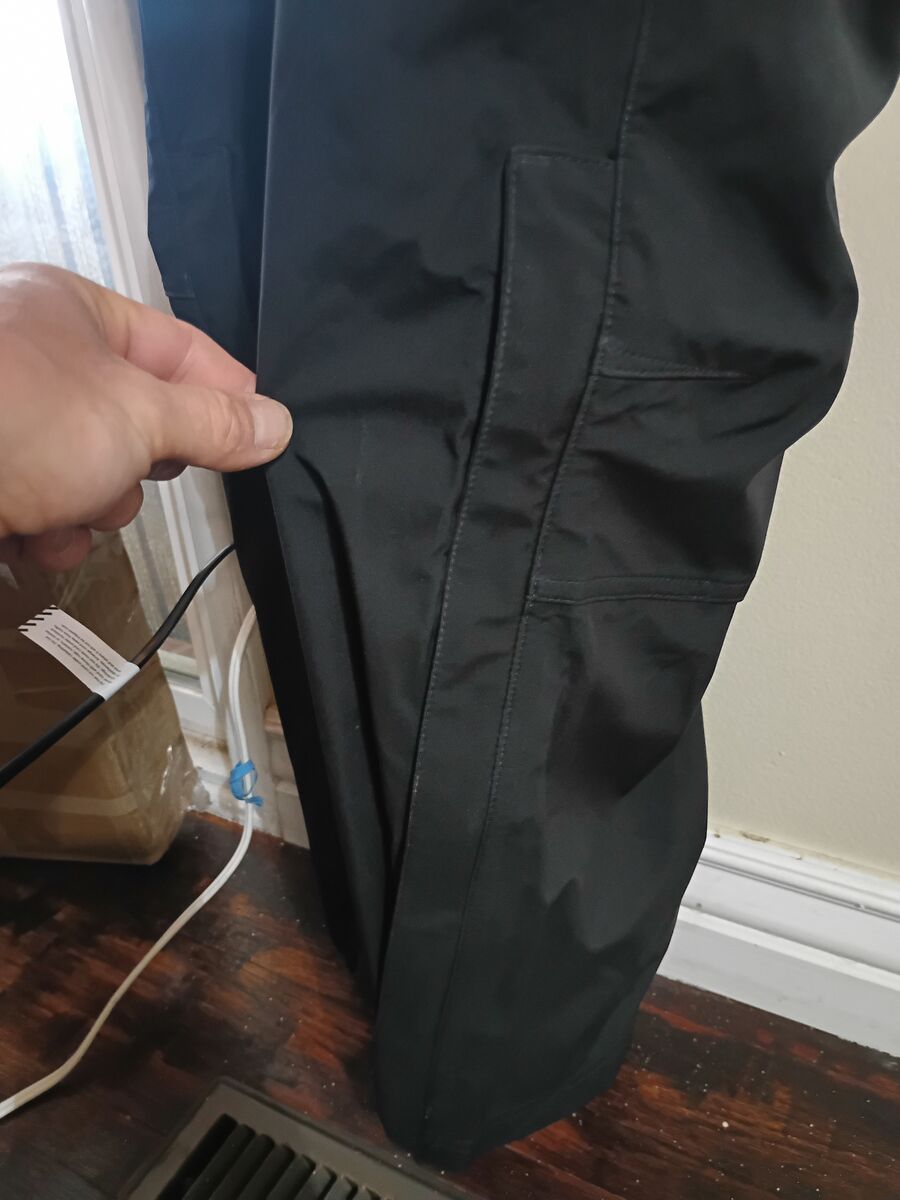 Large size and like new bibs, had been used lightly a few times just outside to sled or shovel. Provides excellent water repellent and insulation! Stretchable fabric is perfect to get out and move more while staying dry. Double front zipper, easy access for chest/body ventilation and extra big side cargo pockets, legs have zippered gaiter style cuffs for easy off/on of bibs and works great for keeping snow out.
