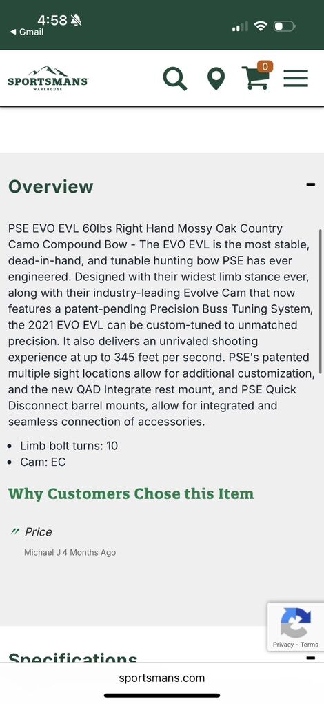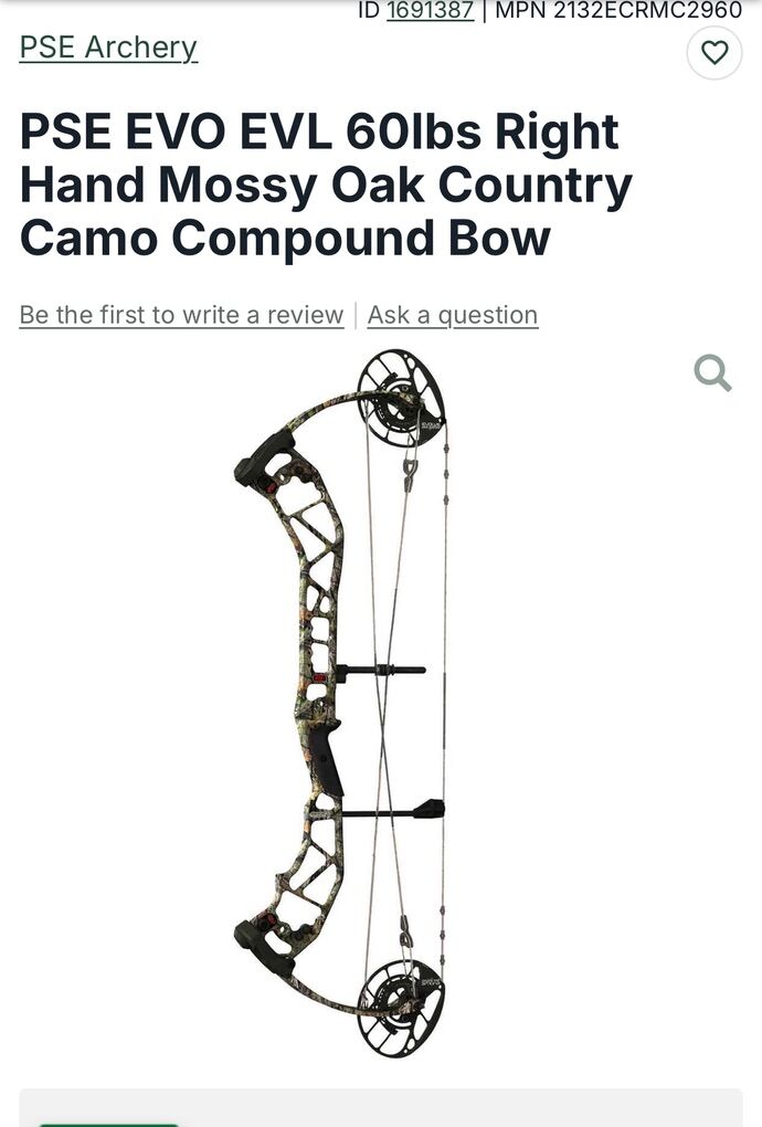 PayPalThis is a PSE EVO EVL 60lb right handed bow. All details are listed in the photos. I bought it new in-store June 2025. The sight is included, but the level/bubble is off. Everything works great, it just isn’t a great fit for me. I snagged a nice 4pt with it this fall so it’s broken in for ya.