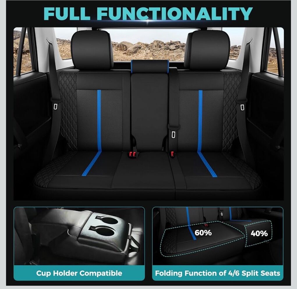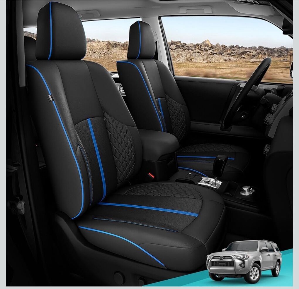 Custom Fit: These custom leather car seat covers are designed specifically for Toyota 4Runners with 2-row 5-seater model-2011 2012 2013 2014 2015 2016 2017 2018 2019 2020 2021 2022 2023 2024. Please note: The seat covers for Toyota 4Runner 2011-2024 are NOT compatible with the 3-row 7-seater model. Faux Leather: Our leather seat covers feature a luxurious 4-layer construction with elastic sponge, seat protector are breathable, comfortable, durable, and easy to clean. Perfect for off-roaders, families, and pet lovers, these interior covers protect your seats from mud, snow, rain, claws, and spills. Stylish Design: black car seat covers meet OEM specifications, providing a sleek upgrade while ensuring comfort and functionality. Access seat belts, airbag deployment, and seat adjustments effortlessly, plus keep the rear cup holder fully functional. Preserve Seat Functions: Our custom seat covers for Toyota 4Runner are designed to maintain compatibility with your vehicle's original features, including airbags, seat belt buckles, cup holders, and seat adjustment buttons, ensuring your driving safety. 4Runner 2011-2024 Seat Covers also support the installation of child safety seats, as well as partial folding of rear seats. Easy Installation: Each set comes with detailed instructions and installation videos, along with all the necessary tools, including gloves and a prying tool. Perfect for DIY enthusiasts—just a little muscle is all you need for a snug fit.