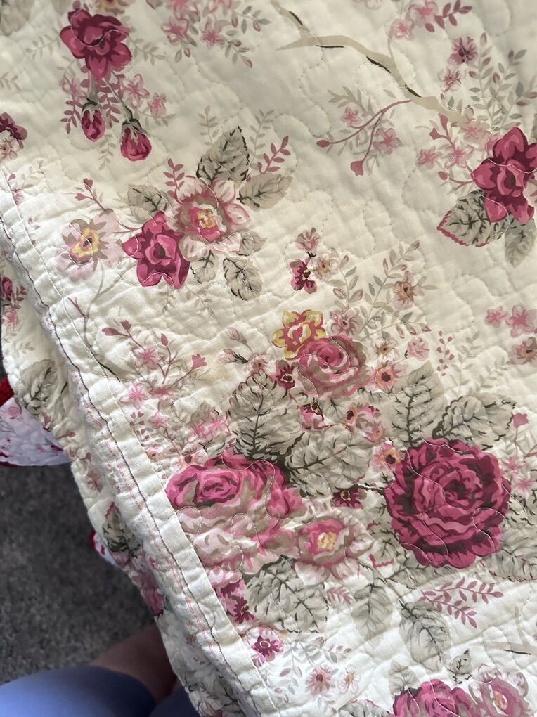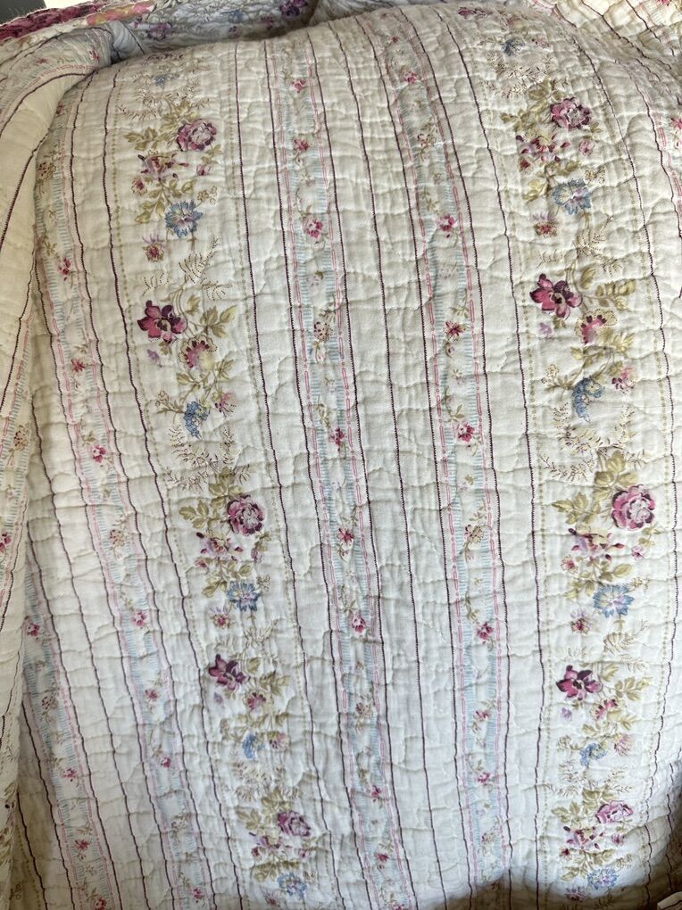 VenmoLike new, and only on a guest bed that was rarely used. Queen combed spread, bed skirt, 2 shams, sheer curtains (59”x63”). No stains, just cleaned and smoke free home.
