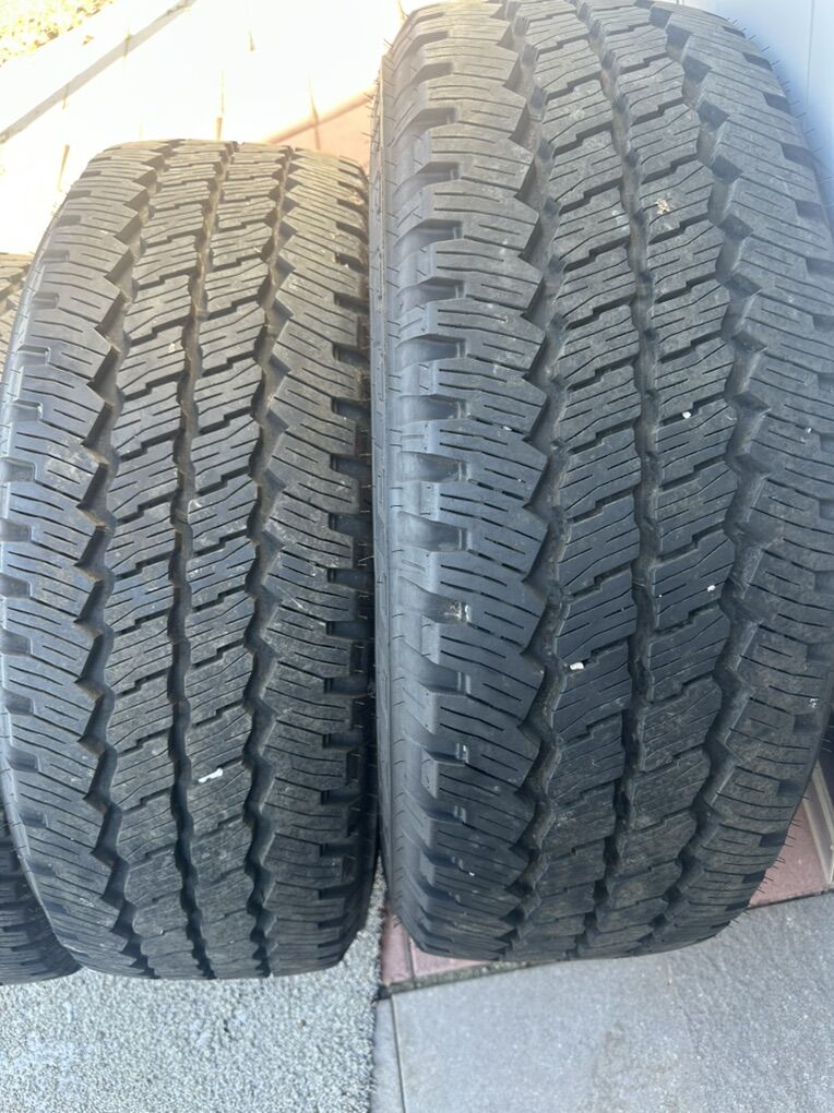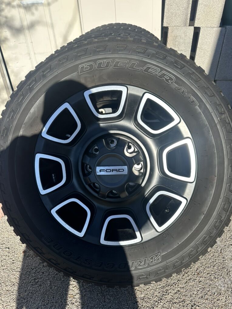 Set wheels and tires of 2025 Ford F350 platinum Size 275/65/20 tires are Bridgestone Dueler A/T Lees 600 miles and them 8 lug Also center cups and 32 lug nuts included Good condition no issues price is Firm