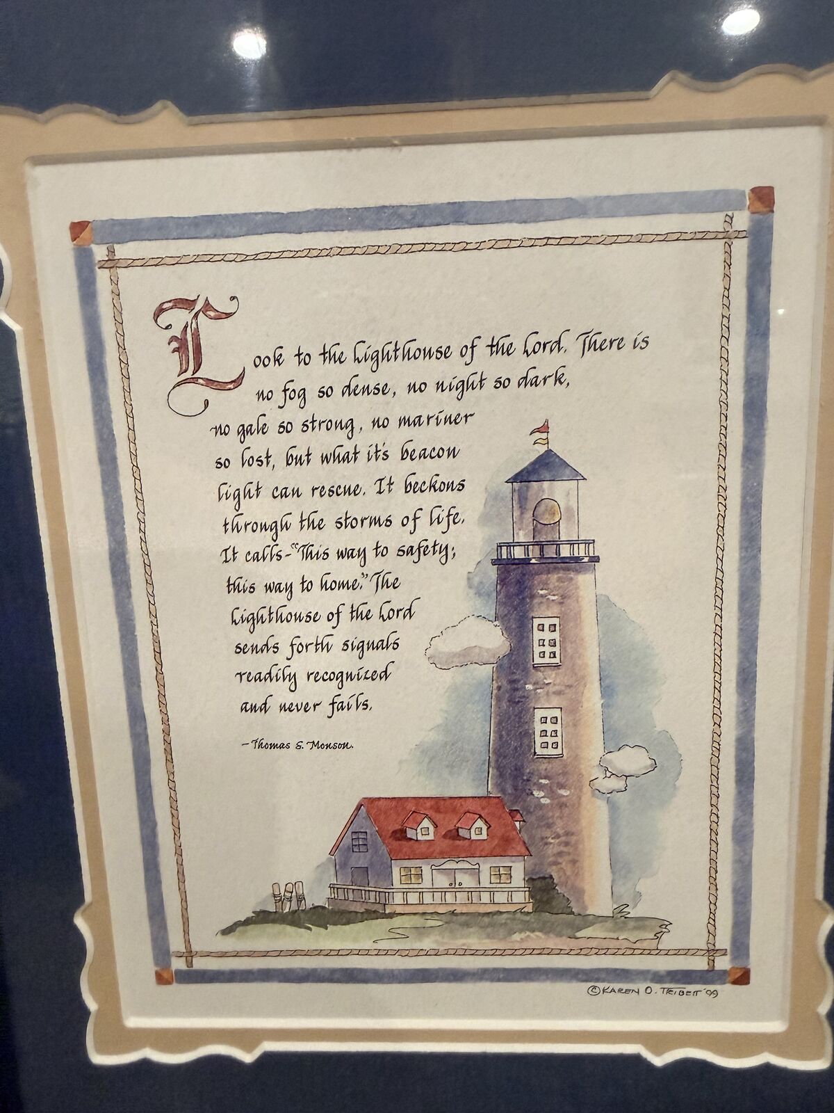 VenmoThis is a poem by Thomas S Monson of the Lighthouse of the Lord. It is framed in a 10x12 wood frame. It is a water color picture.