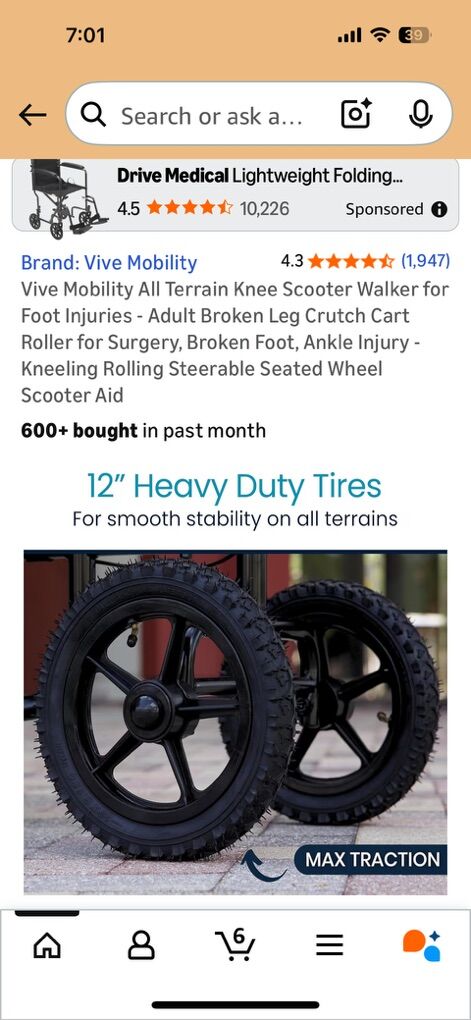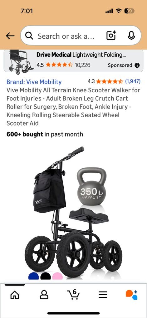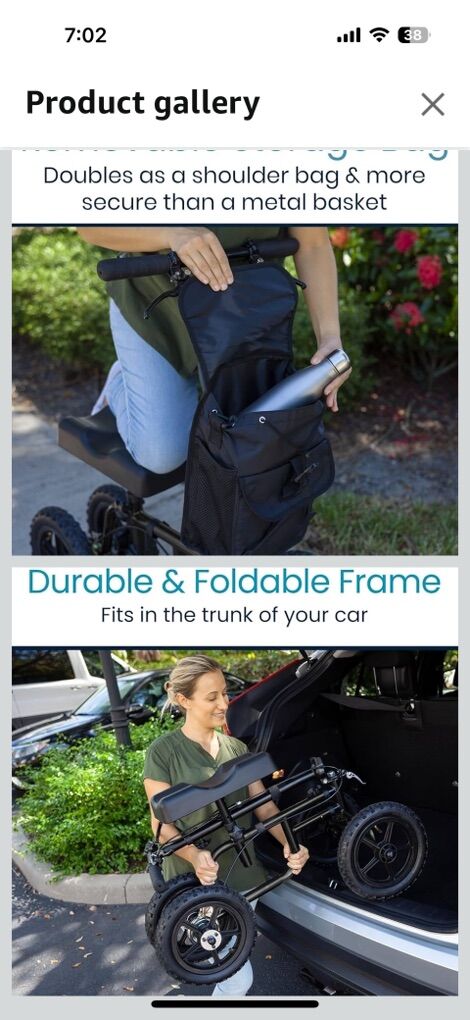 Hefty Knee scooter beefy tires. Works perfect. Nothing wrong. Comes with a bag and extra knee pad. 350lb limit. Sells for $199 on amazon. Folds up for transportation. See all images.