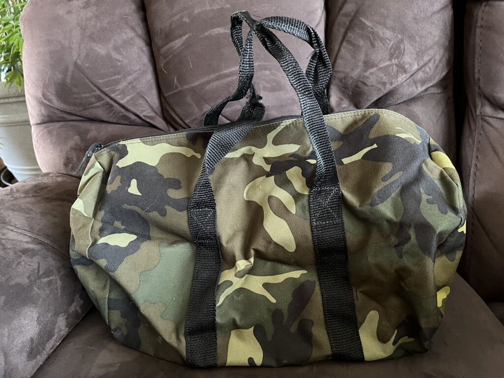 Small camouflage Duffle Bag . Measuring approximately 17 inches in length 9 1/2 inches in height .$7 Call 385-202-9997