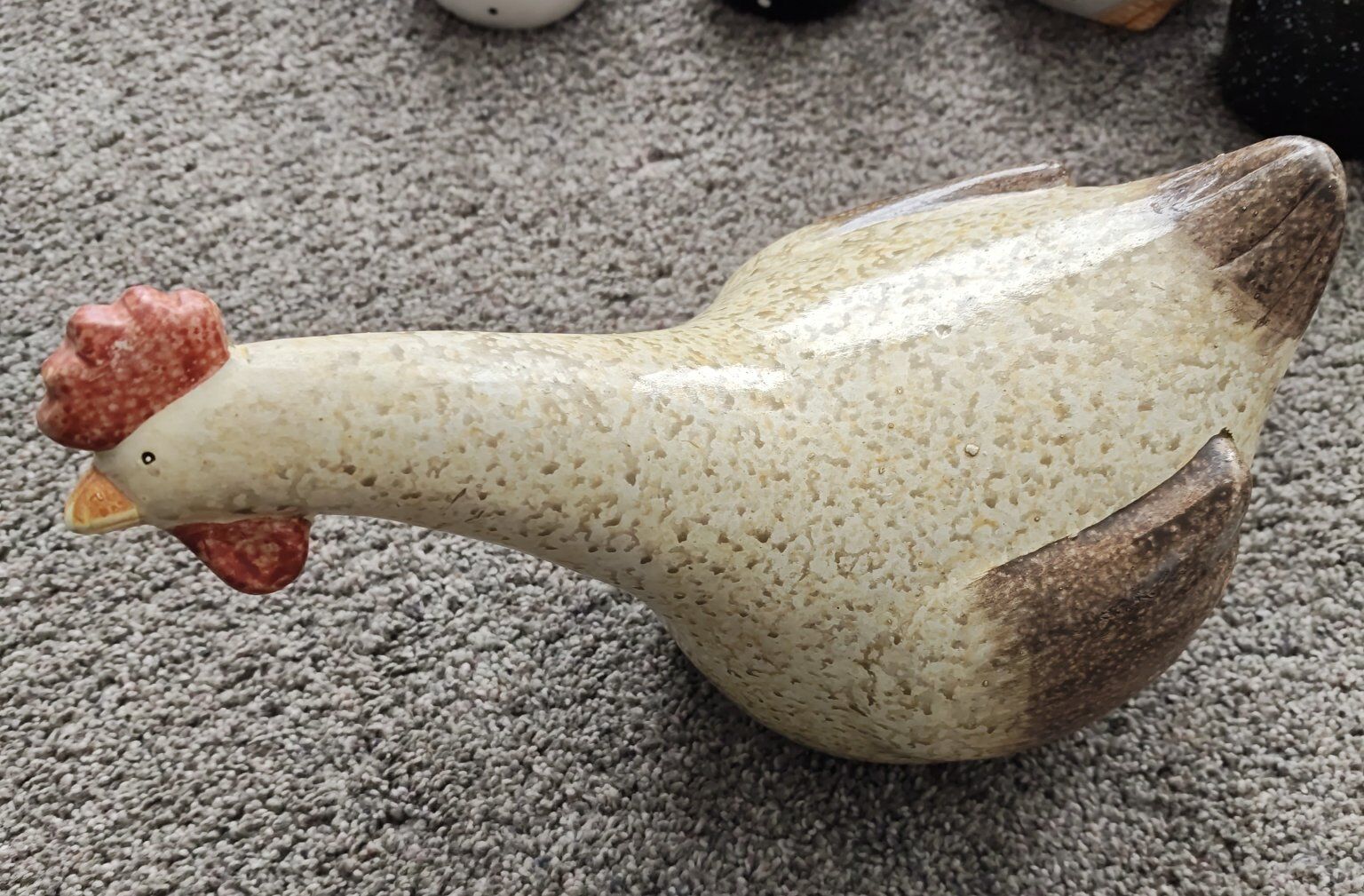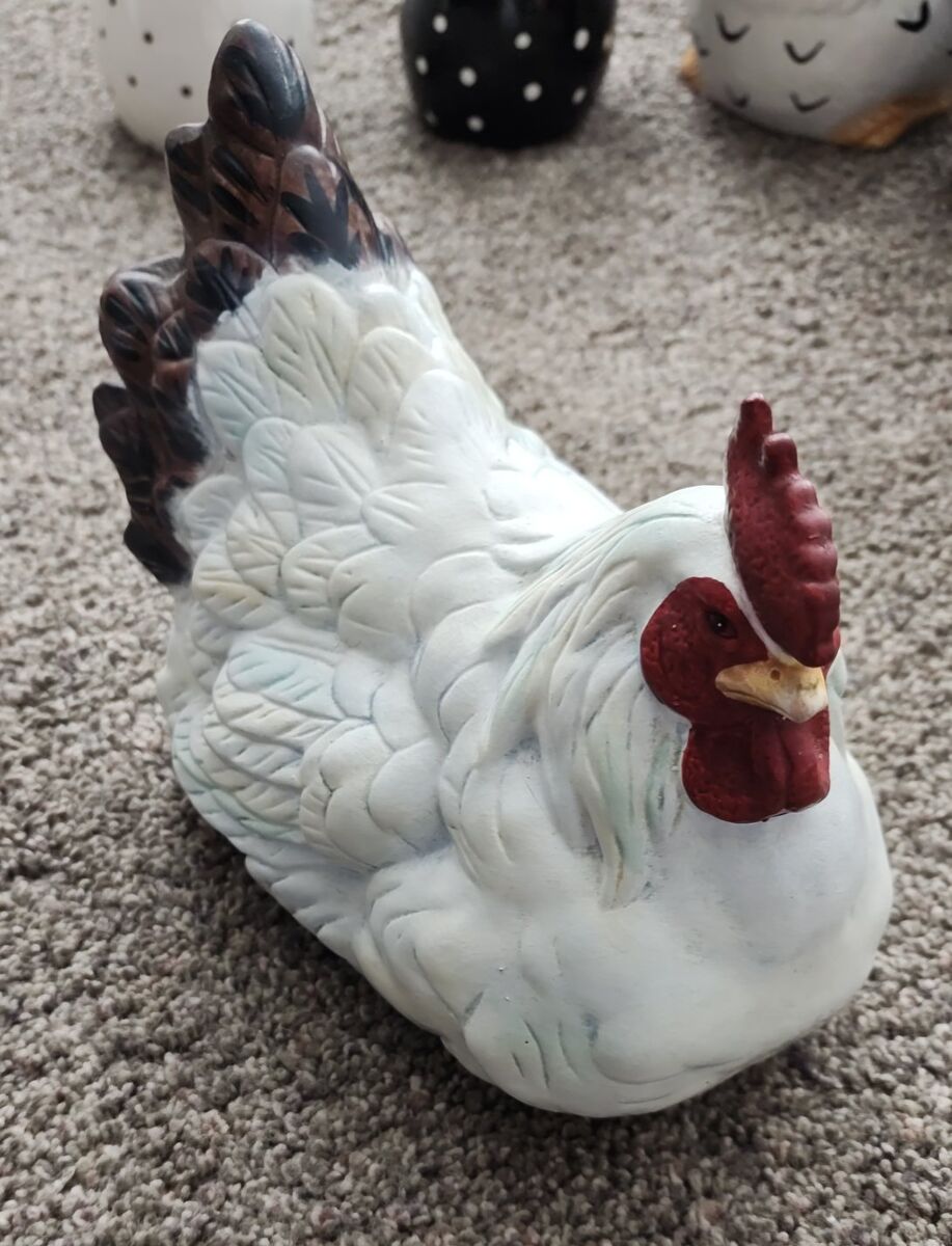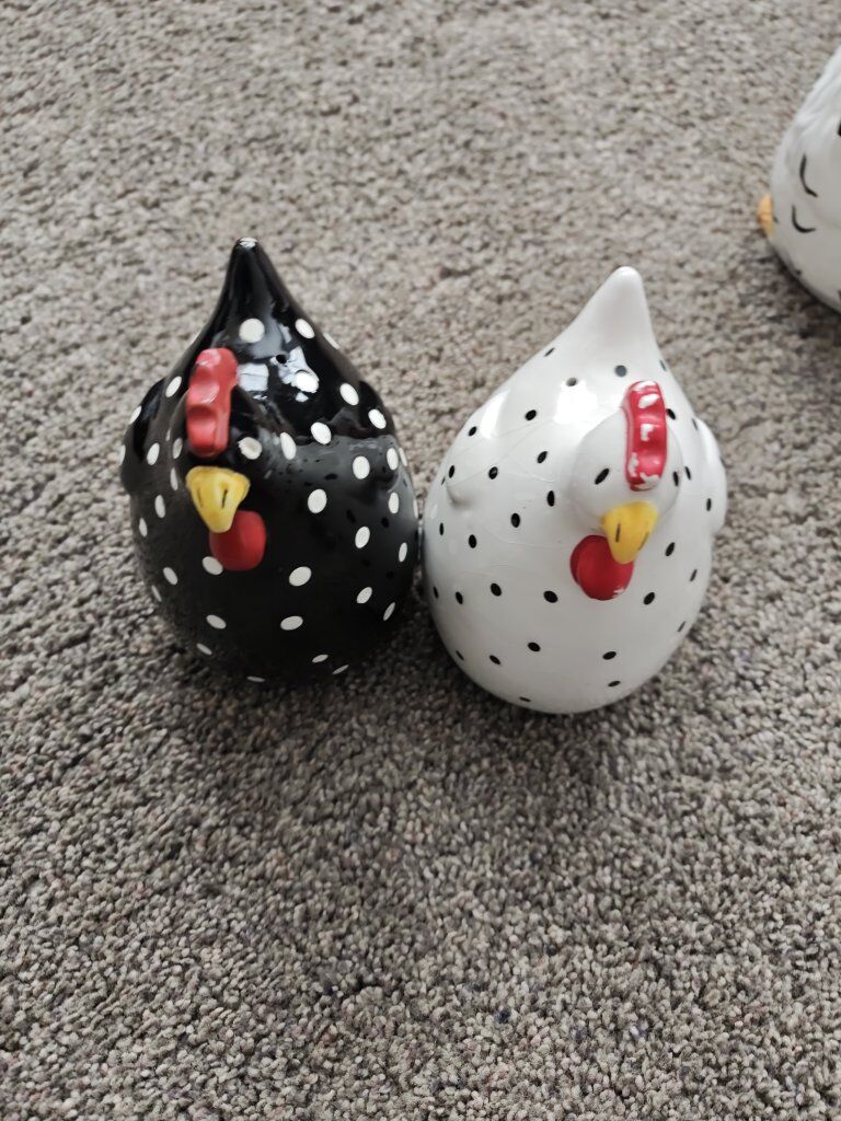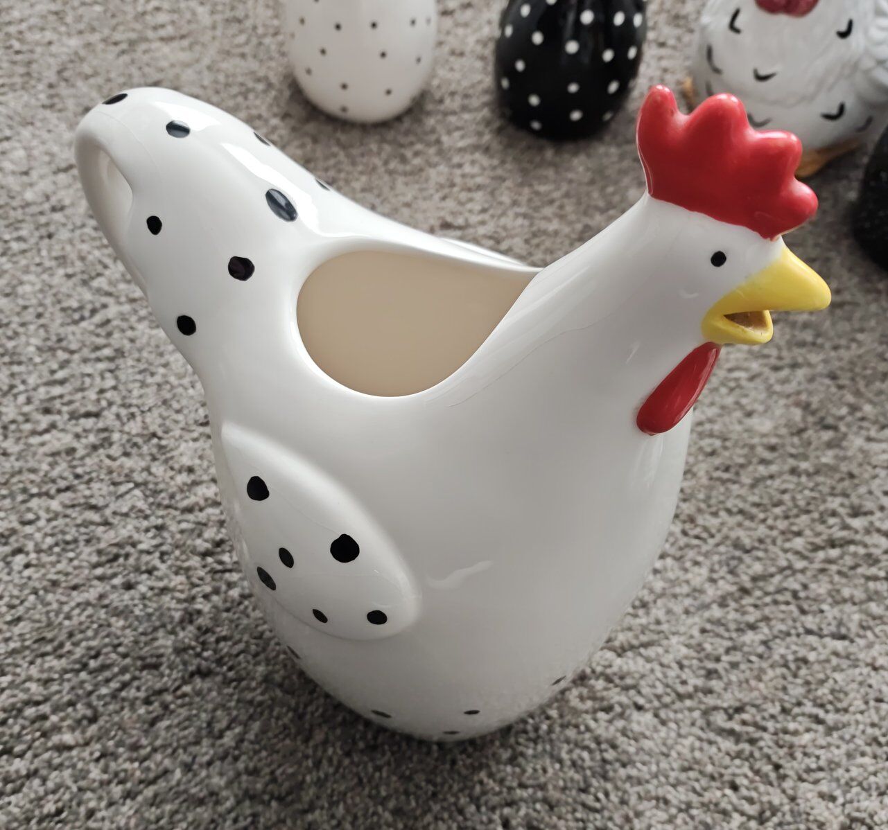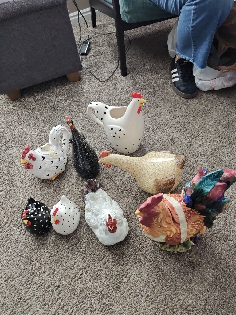 Eight chickens are looking for a new home! Salt and pepper shakers, 3 pitchers others that are mostly decorative one could maybe be a tiny cookie jar.