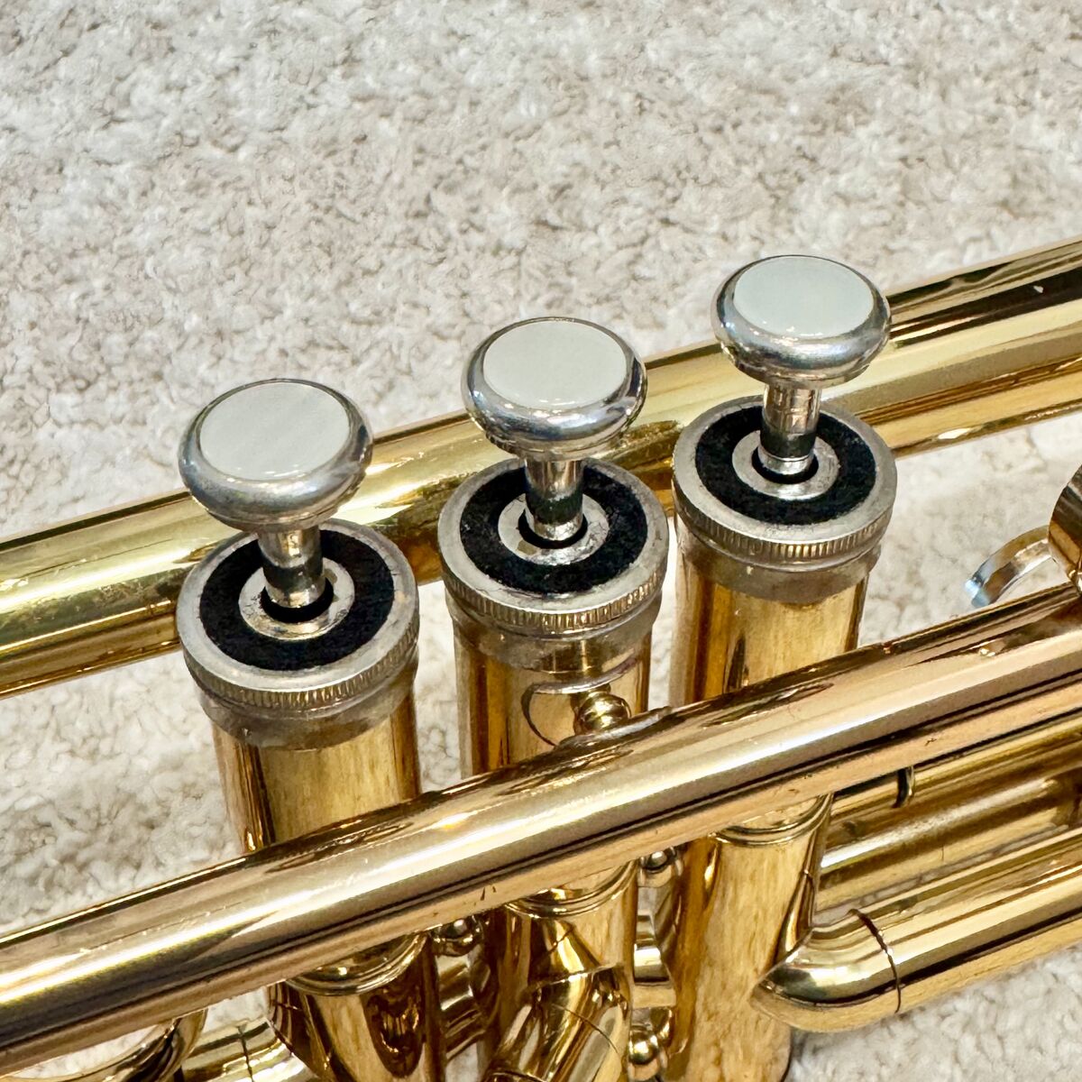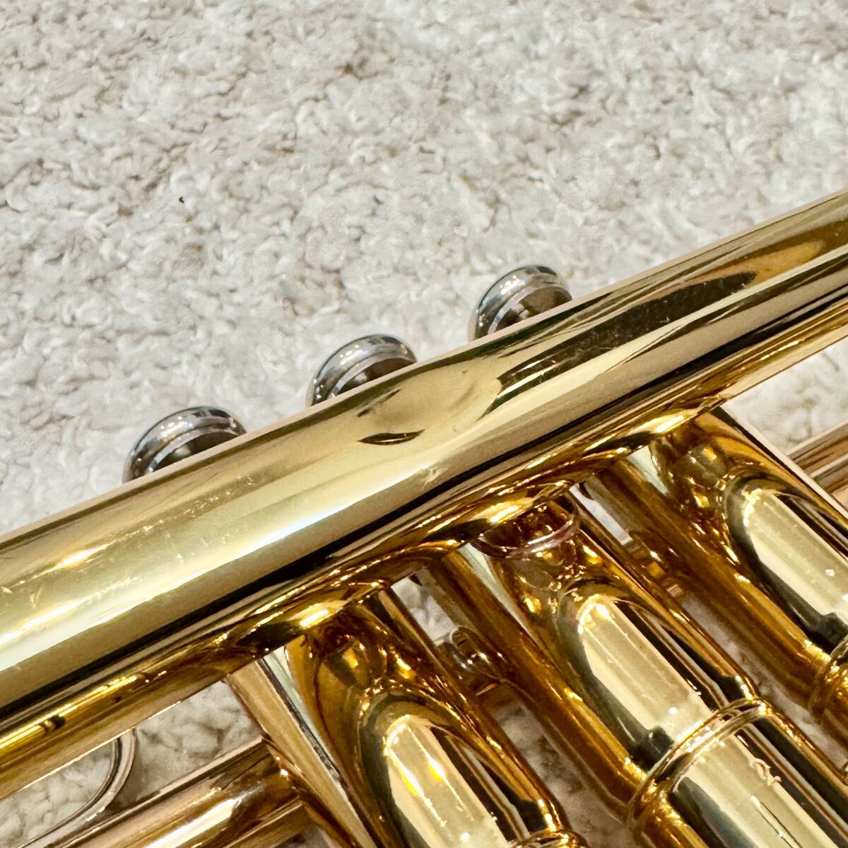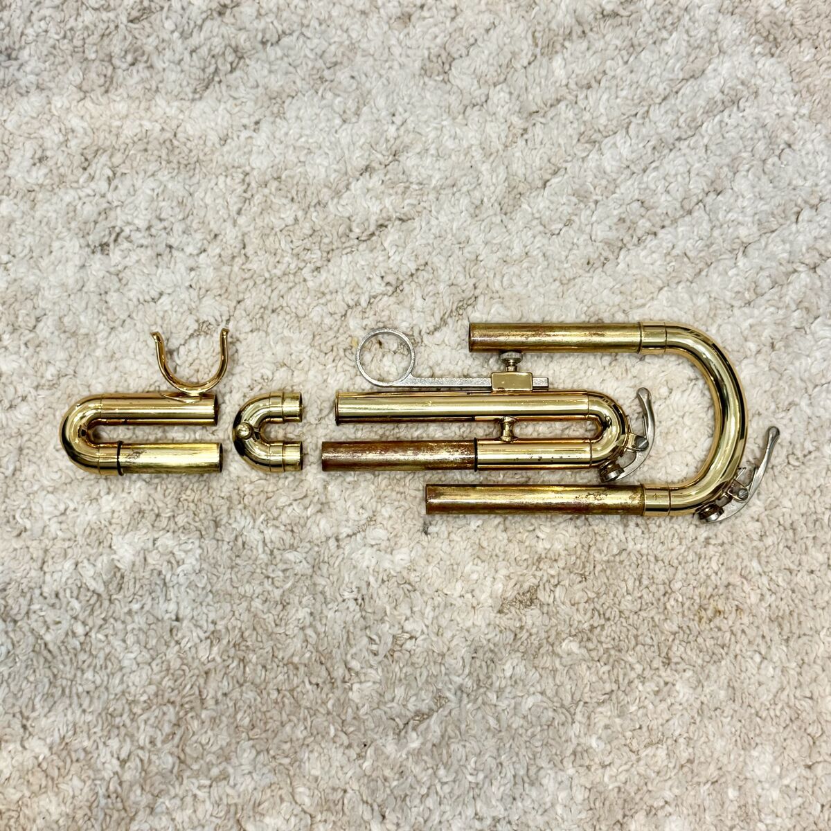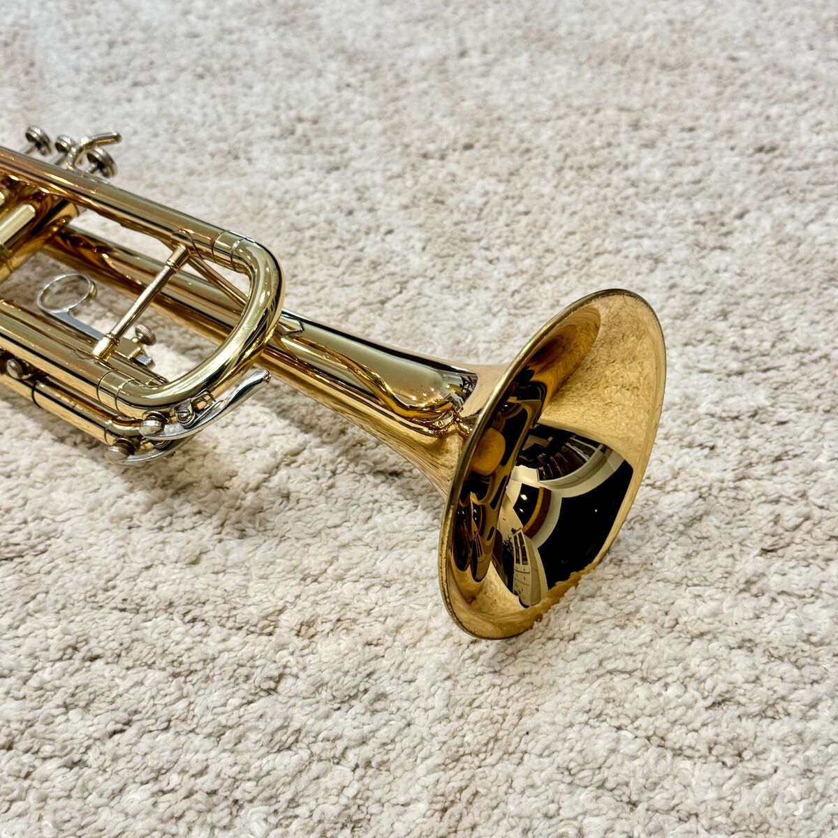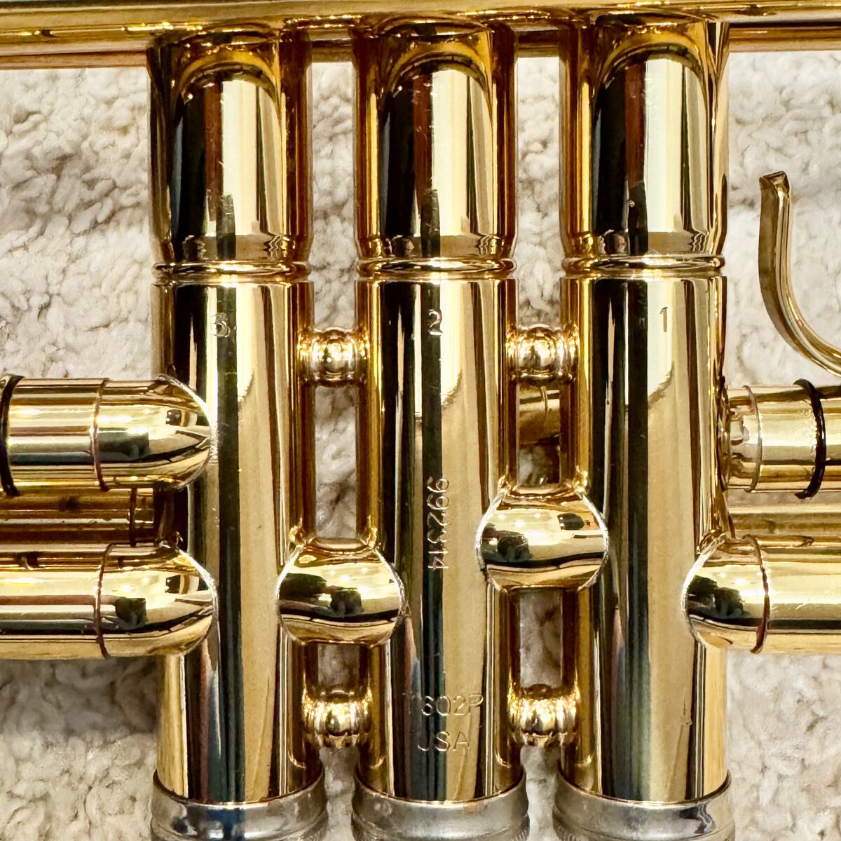 VenmoHolton T602P Bb trumpet, made in the USA. Valves are smooth with good compression, slides move freely. Nickel-plated trim. Finish shows cosmetic wear and lacquer loss from normal use (see photos), no major dents. Solid, reliable player and a good school-band horn.