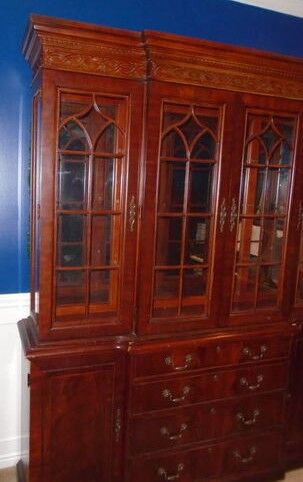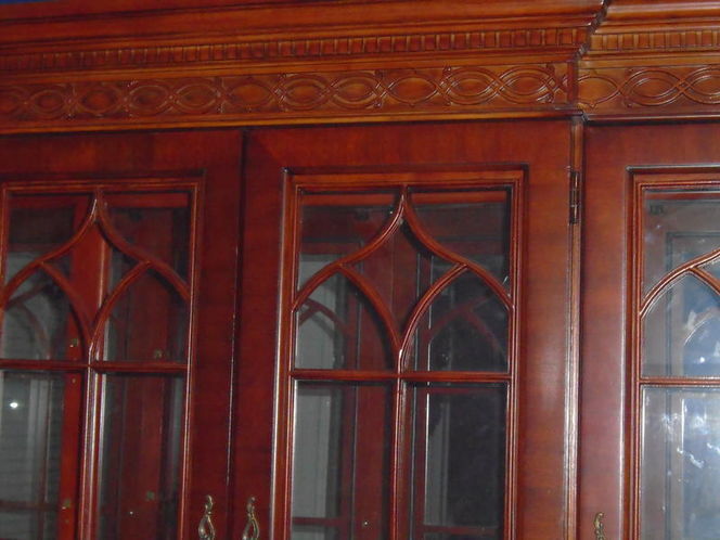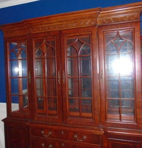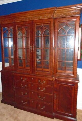 This is an awesome dark wood china lighted display cabinet hutch with nice detail.. The pictures make it lighter than it really is. The top portion has a mirror back with several glass shelves. Lots of storage space. Great detail and design. Absolutely love this piece but we have to let it go. Paid just over $1700 originally. Dimensions are 6' wide and 7'2" tall and 18' deep. It separates into 2 pieces. Some scratches on the base piece but mostly covered with the top piece. You must pick up and be able to load. CASH AND PICKUP ONLY. Text preferred.