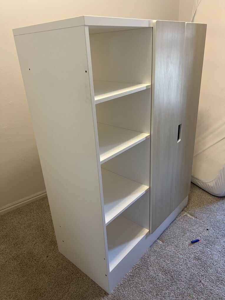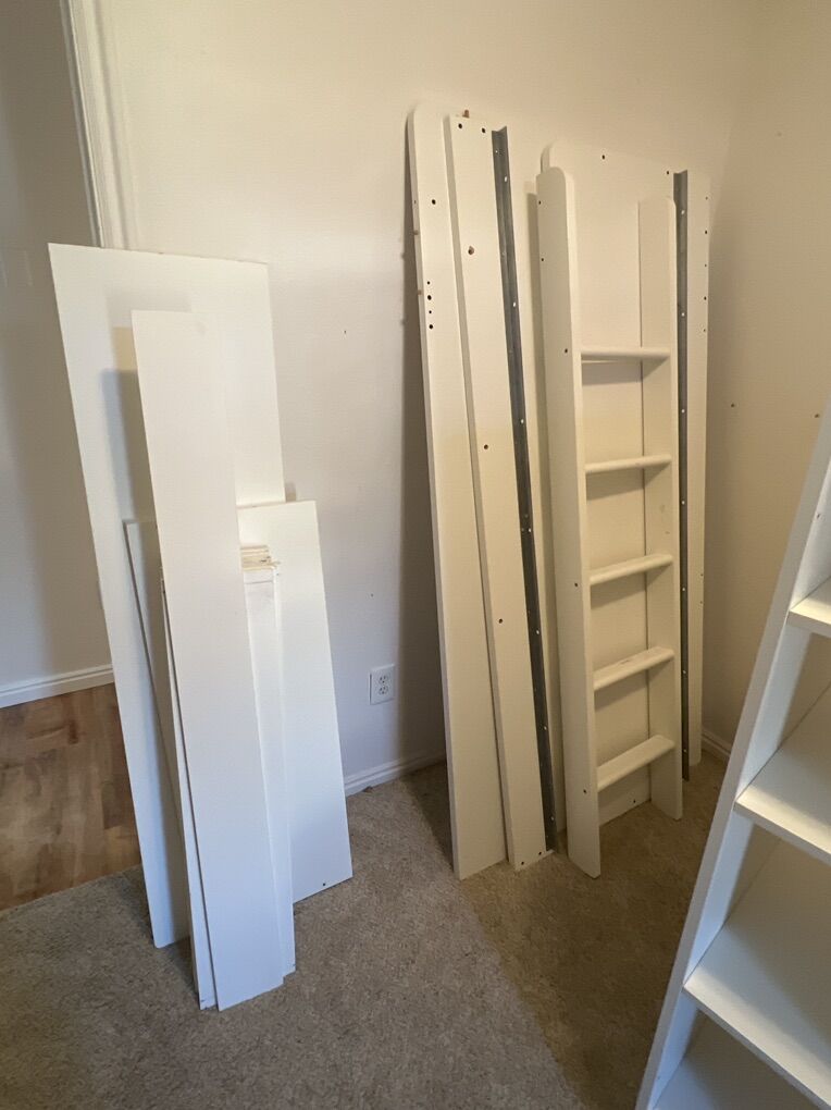We've disassembled it and it's ready for a new home! Last two photos show how disassembled it is. We left the shelves and cabinet together. NO mattress included
