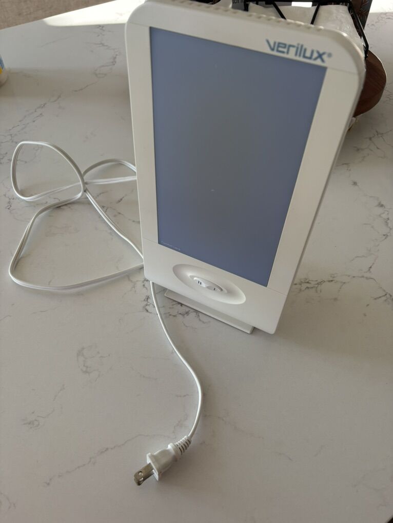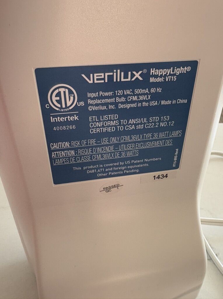 The Verilux VT15 refers to the Verilux HappyLight Liberty Mid-Size Energy Lamp, a specific model of full-spectrum light therapy device designed to mimic natural sunlight to improve mood, energy, and focus, combating winter blues, jet lag, and fatigue by providing up to 7,500 LUX of UV-free light. This older, reliable model features glare-reducing lenses, multiple light levels for customization, and is known for its compact size, often sought as a replacement or used unit.