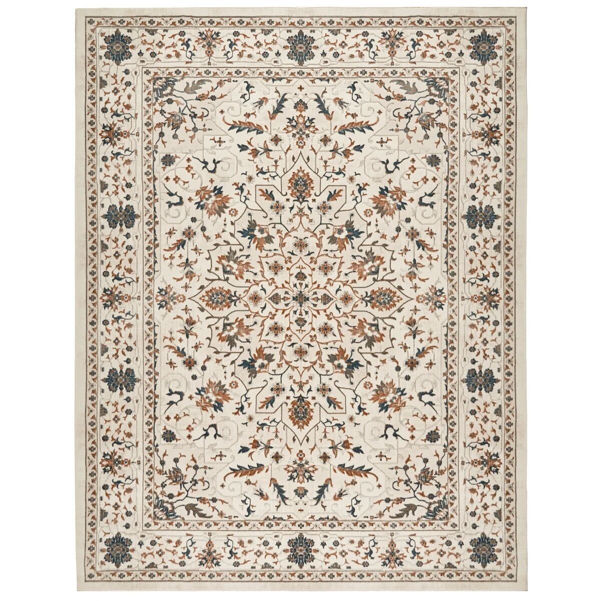 The Hampton Court Area Rug offers a sophisticated, timeless look with traditional designs and exquisite detailing, effortlessly adding elegance to any space. Featuring an Ivory background with motifs in soft greys, blues and corals, this rug complements a variety of décor styles. Crafted from high-quality microfiber polyester, it offers exceptional softness and durability, making it perfect for high-traffic areas while maintaining its stunning appearance. Finished with a sturdy jute backing, this rug ensures lasting quality and support.