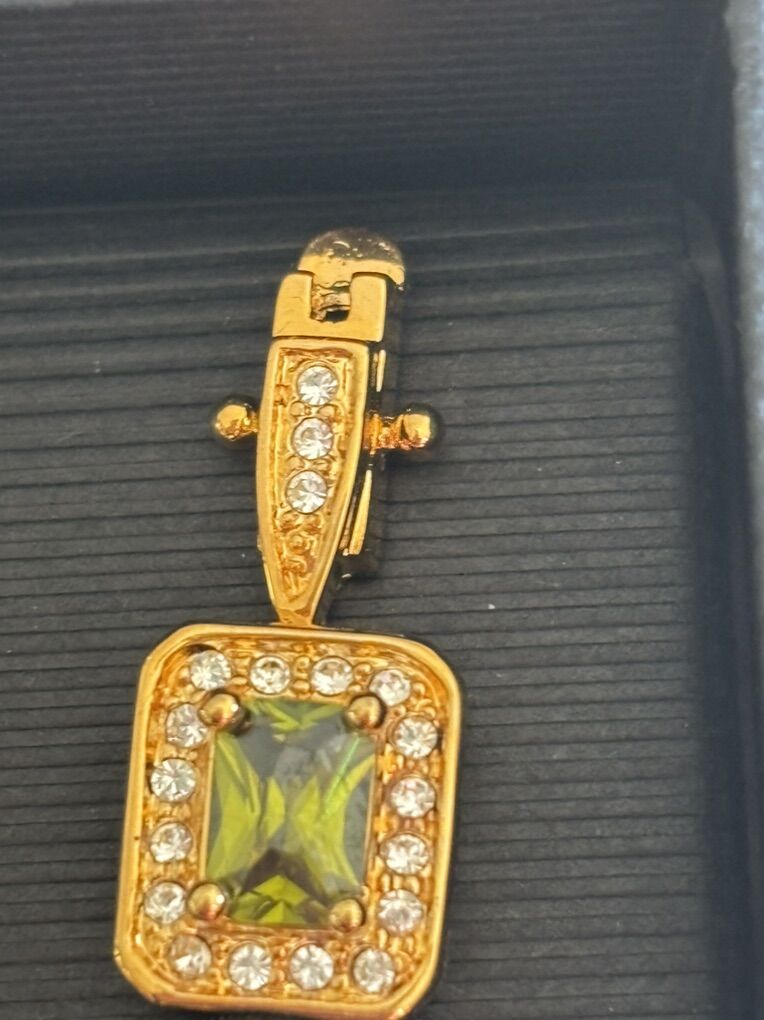 The bracelet is a gold‑tone link bracelet set with square, green gemstones (likely peridot or glass) surrounded by a halo of small clear stones (probably cubic zirconia). The links between the stones are gold‑tone with additional tiny clear stones. The clasp is a toggle type. SIZE 9 The ring is a matching gold‑tone piece with a single square green gemstone centered and encircled by small clear stones. Both pieces are costume jewelry, not real precious stones or solid gold. No advance payment Payment and pick up are at the same time