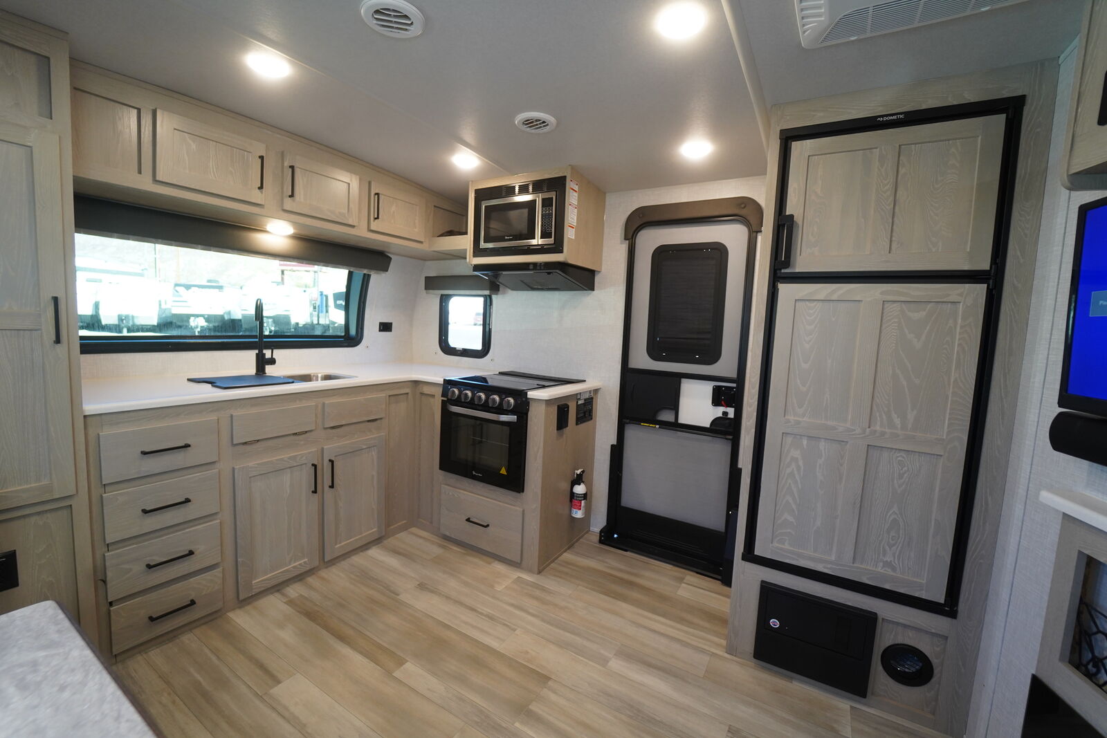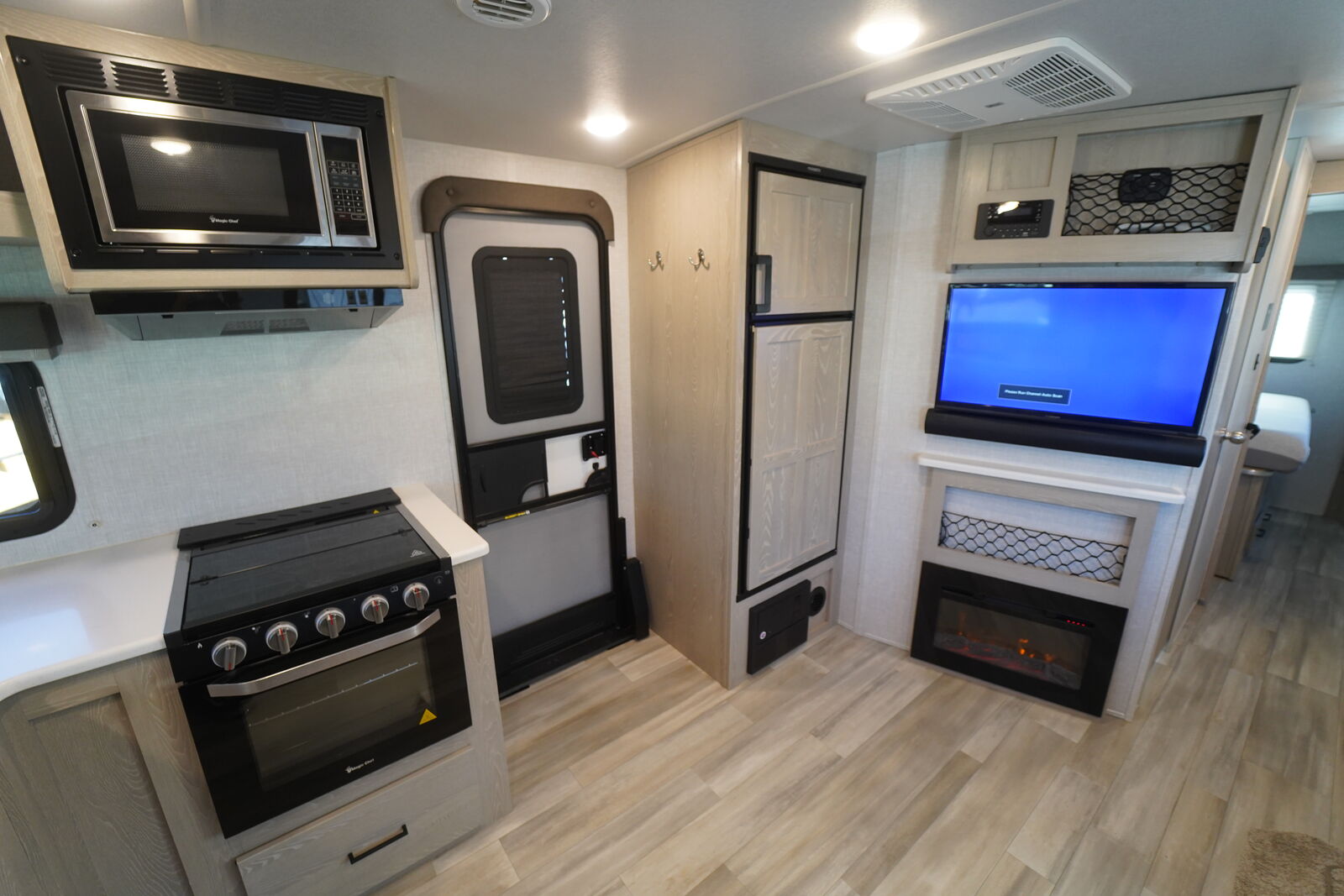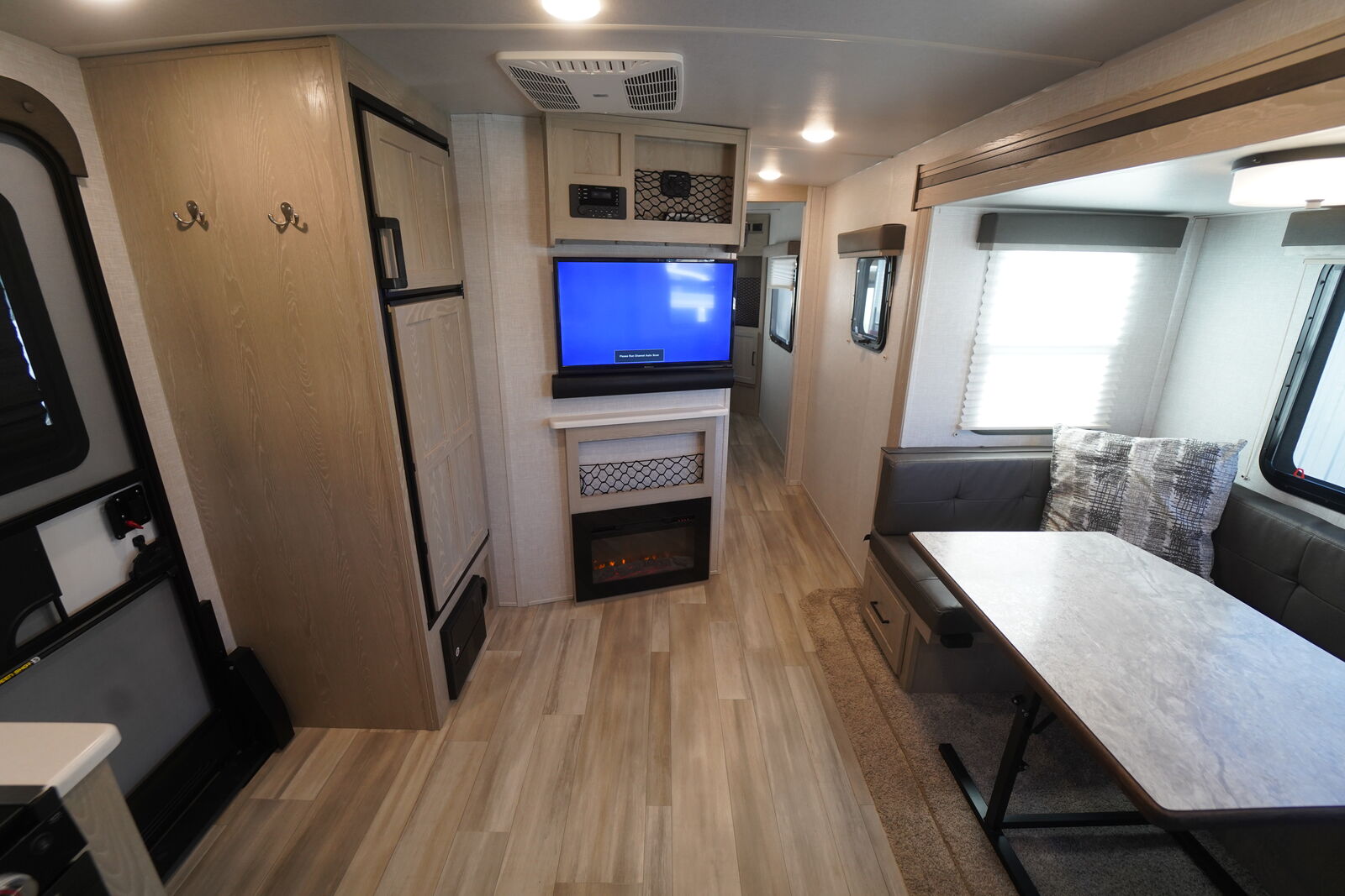 GORGEOUS TRAILER! LOADED UP with all the good stuff like full fiberglass exterior and enclosed underbelly, slide out, outside kitchen AND front kitchen model with fireplace, flat screen TV, mid bathroom with glass enclosed shower and rear QUEEN SUITE!