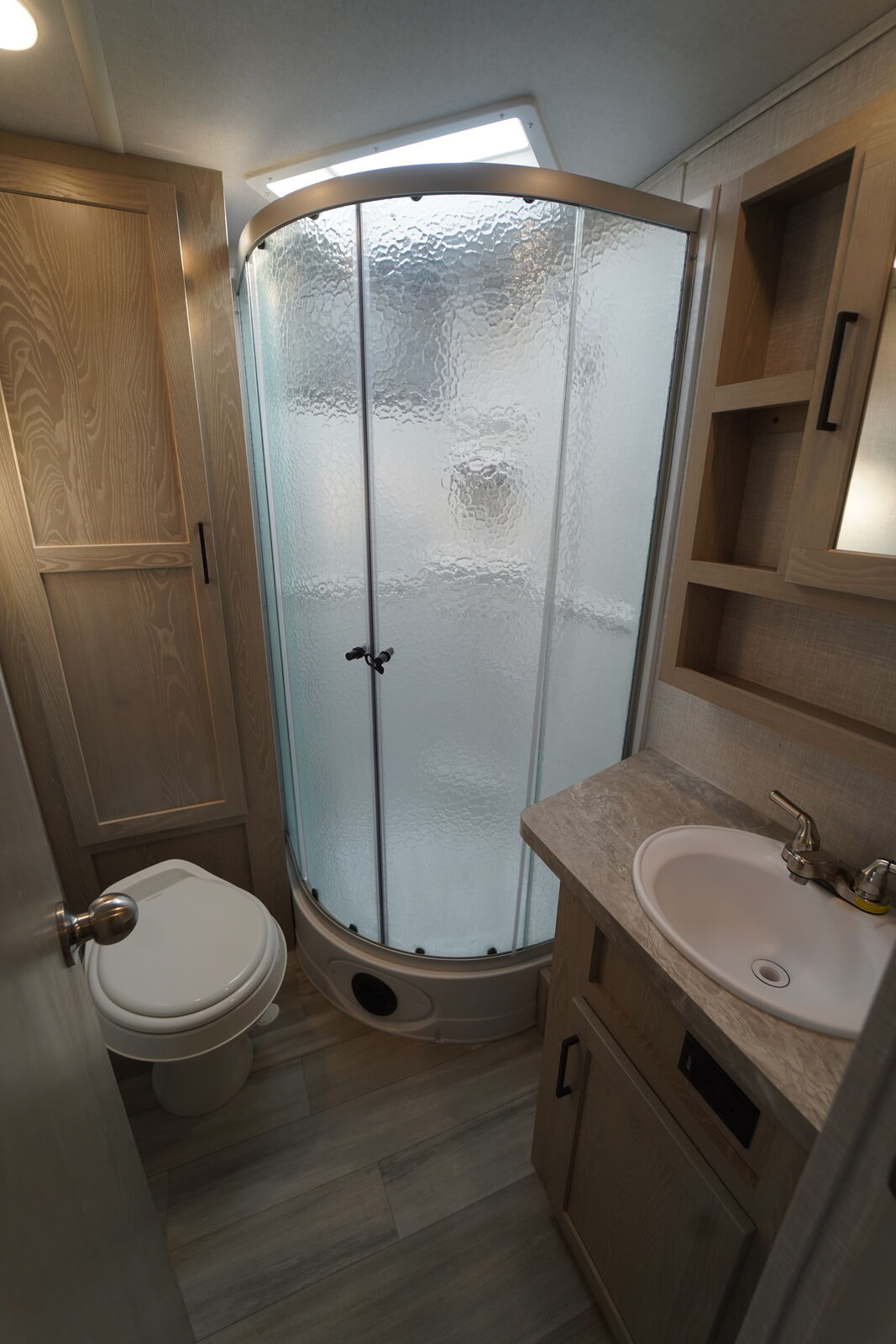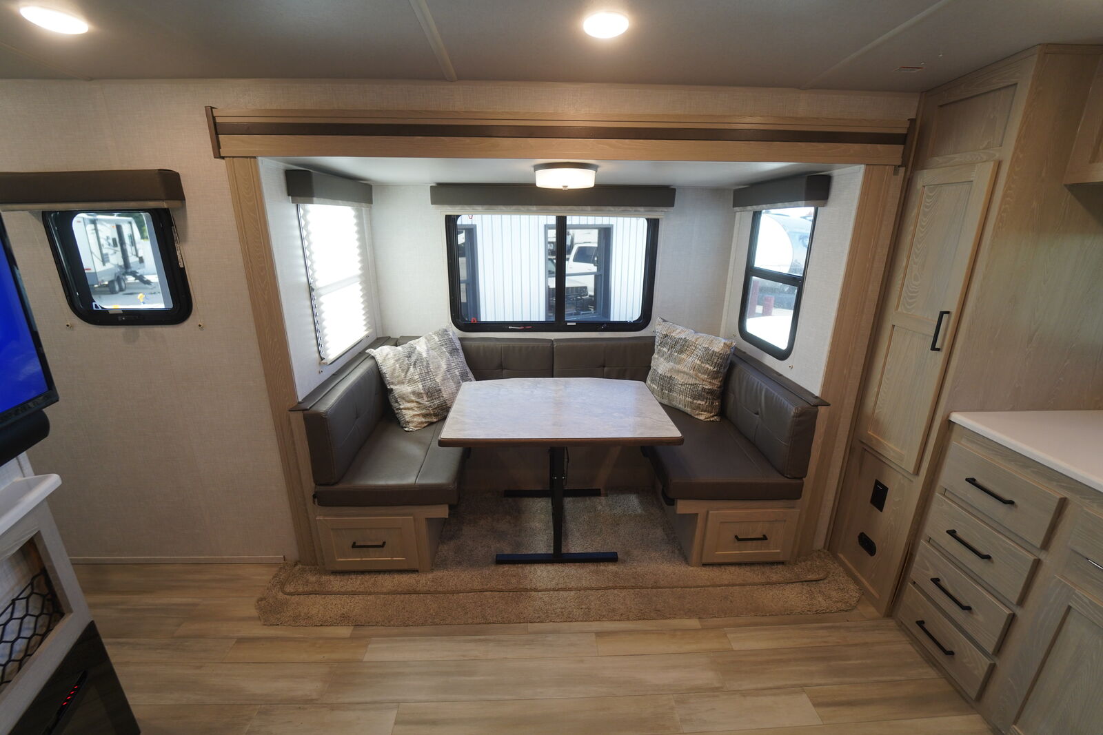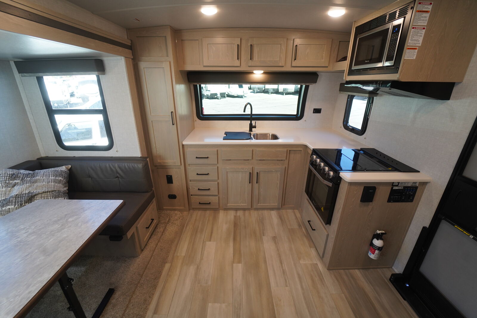 GORGEOUS TRAILER! LOADED UP with all the good stuff like full fiberglass exterior and enclosed underbelly, slide out, outside kitchen AND front kitchen model with fireplace, flat screen TV, mid bathroom with glass enclosed shower and rear QUEEN SUITE!