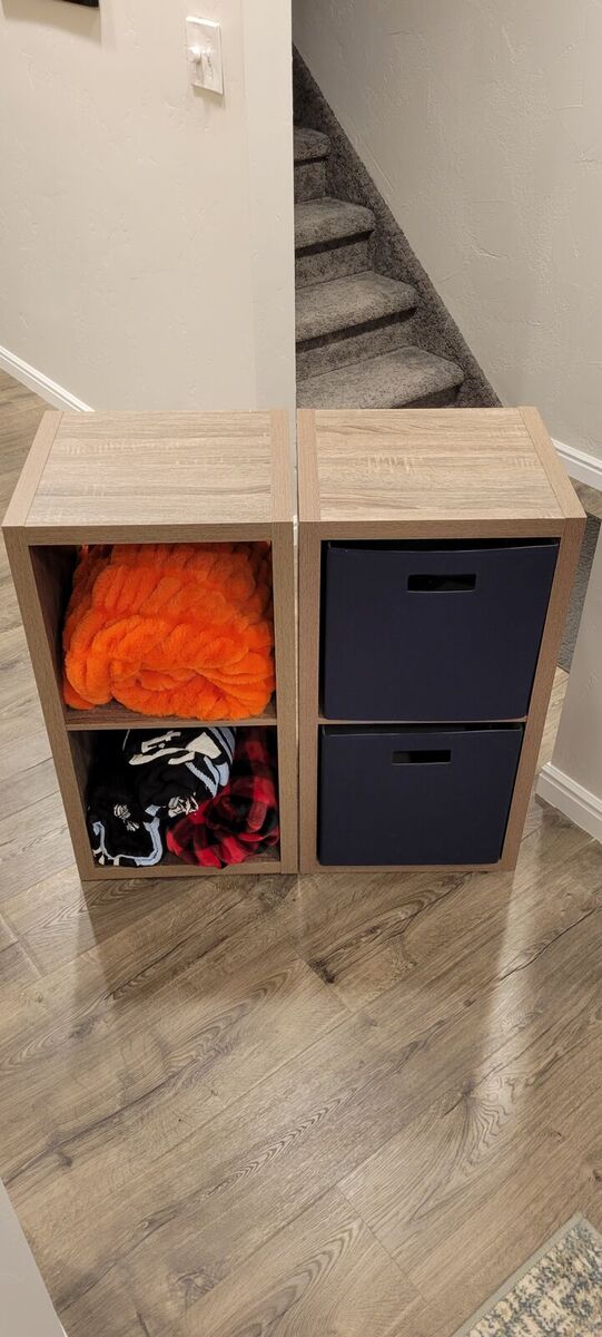 ZelleThese have been used as blanket storage and includes the two blue storage cubes seen in the pictures. Purchased new back in 2021 and were stacked on top of one another at one point. Both are in excellent condition. Size is 16"W x 14.5"D x 30"H and each opening is 13.5" square. Price is for both units and includes the blue storage cubes.