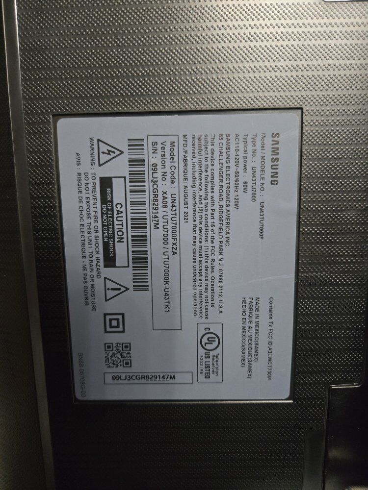 PayPalSamsung 43-inch Class TU7000 Crystal UHD 4K Smart TV. This Smart TV is in pre-owned like new condition. it still has the plastic around the edges, includes power cord and remote. no original box. being sold as is. Retail Price 249.99 (refer to photos)