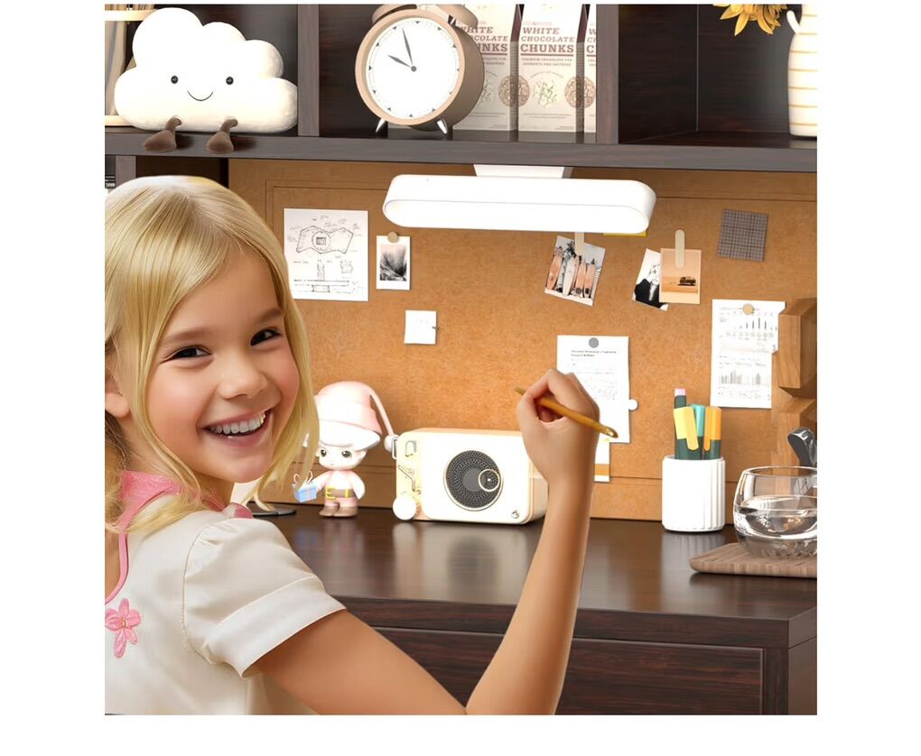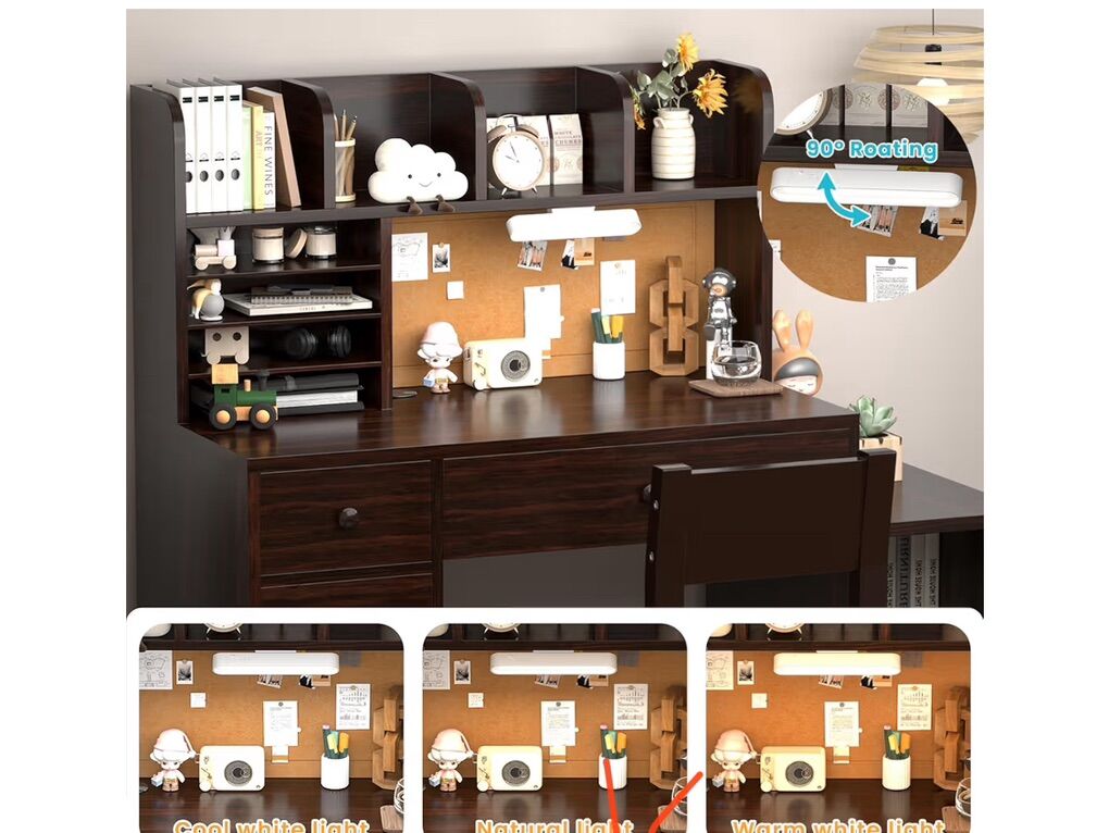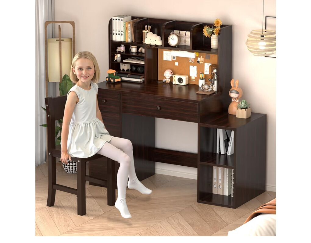 Brown Wooden Kids Study Desk and Chair Set, Childrens Desk with Light, 2 Drawers, 4 Storage Cabinets