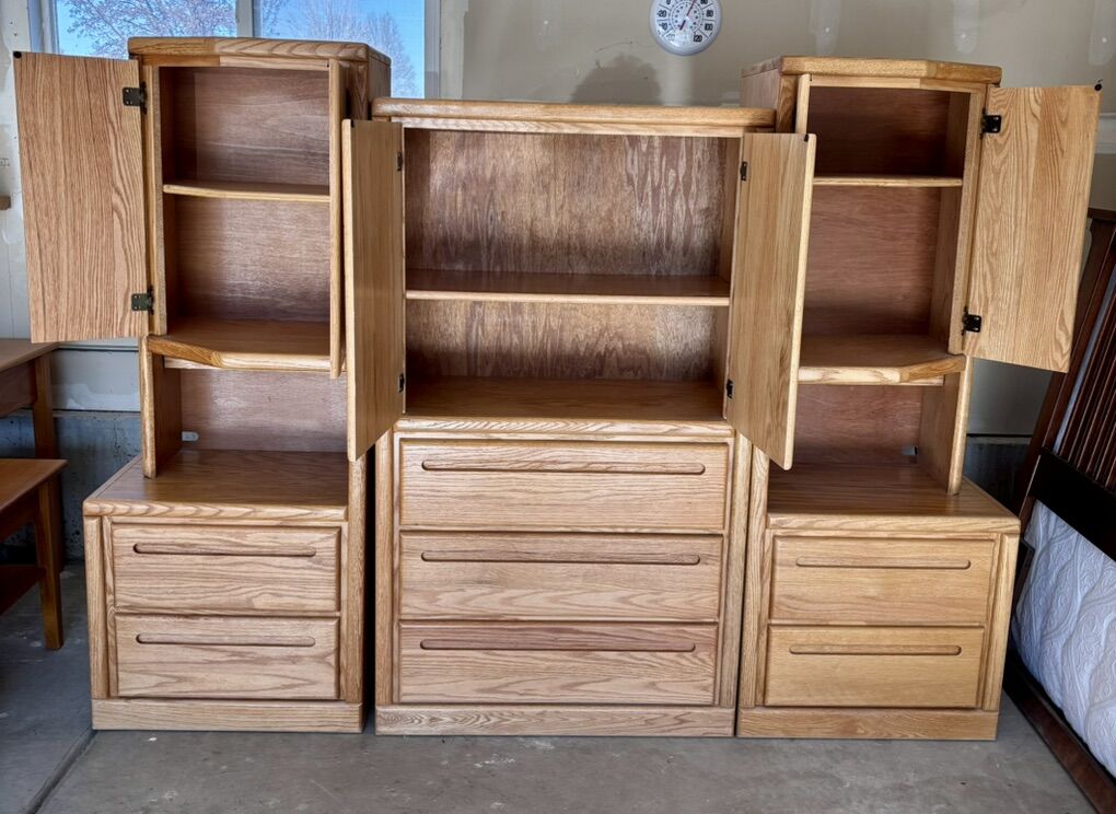 1990s Vintage Thornwood Solid Oak Armoire and Left & Right side Angled Pier Cabinets with lighting. Very sturdy, beautiful condition.