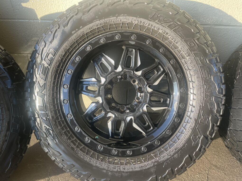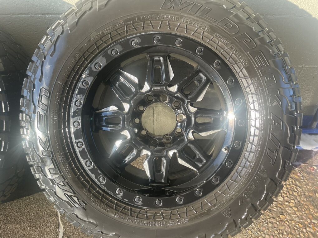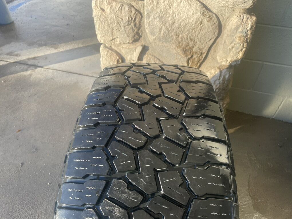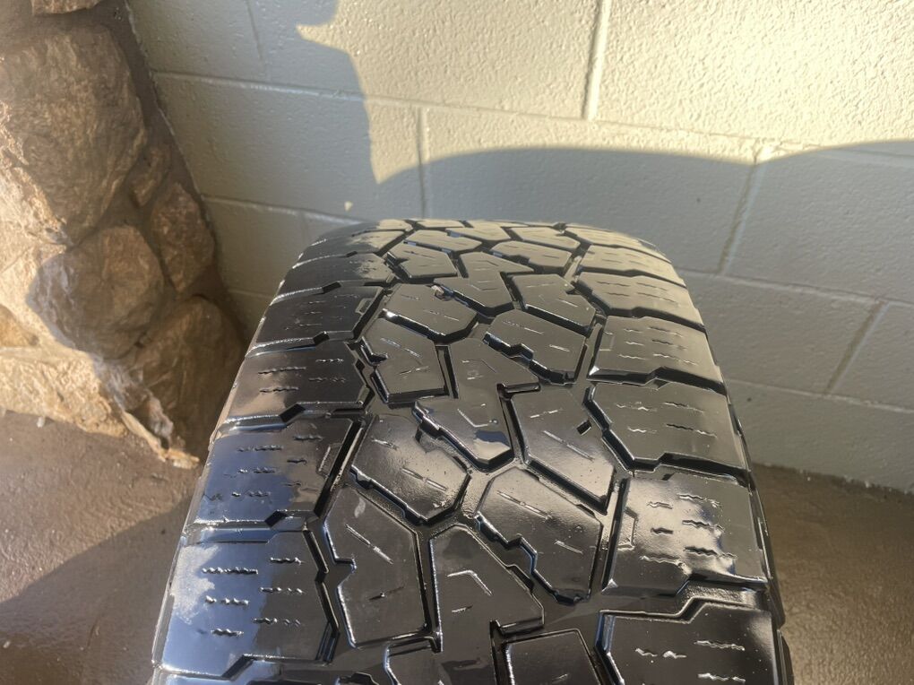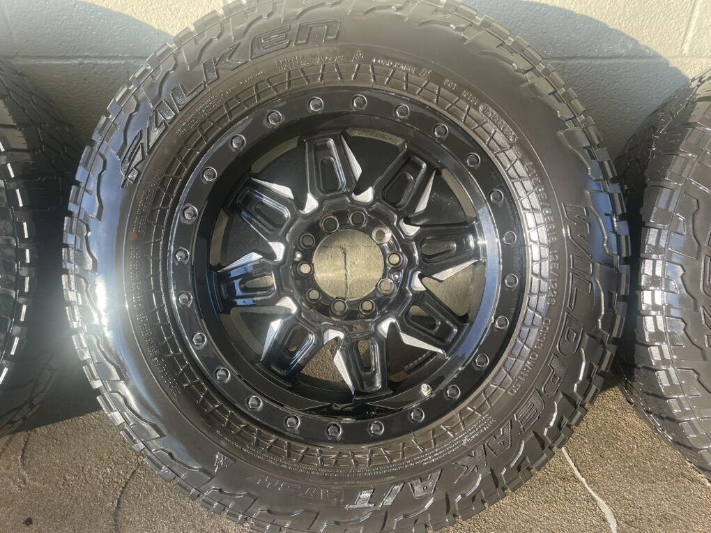 Tires: Falken Wildpeak A/T 285/65R18, marked 33x11.5. They are worn but have some life left on them. Tires are mounted and balanced.