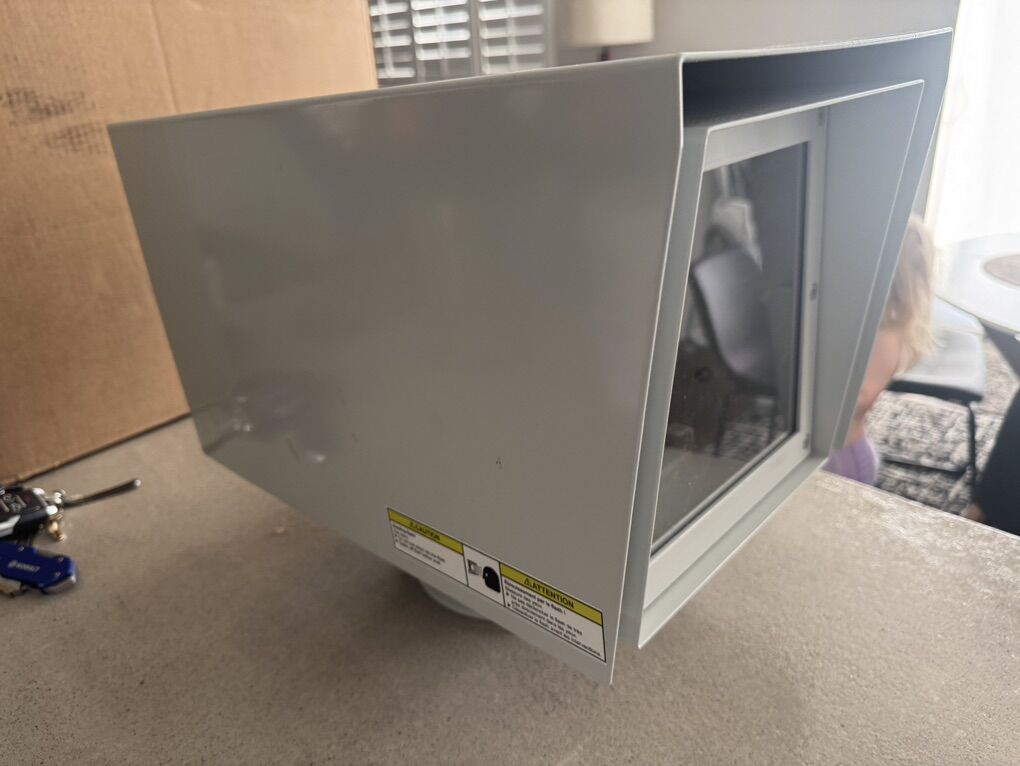 Industrial-Grade Camera/Sensor Housing This is a weatherproof, outdoor housing/enclosure designed for cameras or sensors-most likely a License Plate Recognition (LPR/ANPR) camera enclosure, given several telltale features: • The sun-shielded front window is a common design for protecting camera lenses from glare and weather. • The dazzling flash warning label suggests it's intended for use with cameras equipped with flash or IR illumination. • Inside, you've got terminal blocks, a grounding lug, and structured cable passes, which are typical of professional camera housings that contain integrated power and data wiring. These types of housings are commonly used for traffic enforcement, parking lot monitoring, or perimeter security where durable and tamper-resistant protection is crucial.