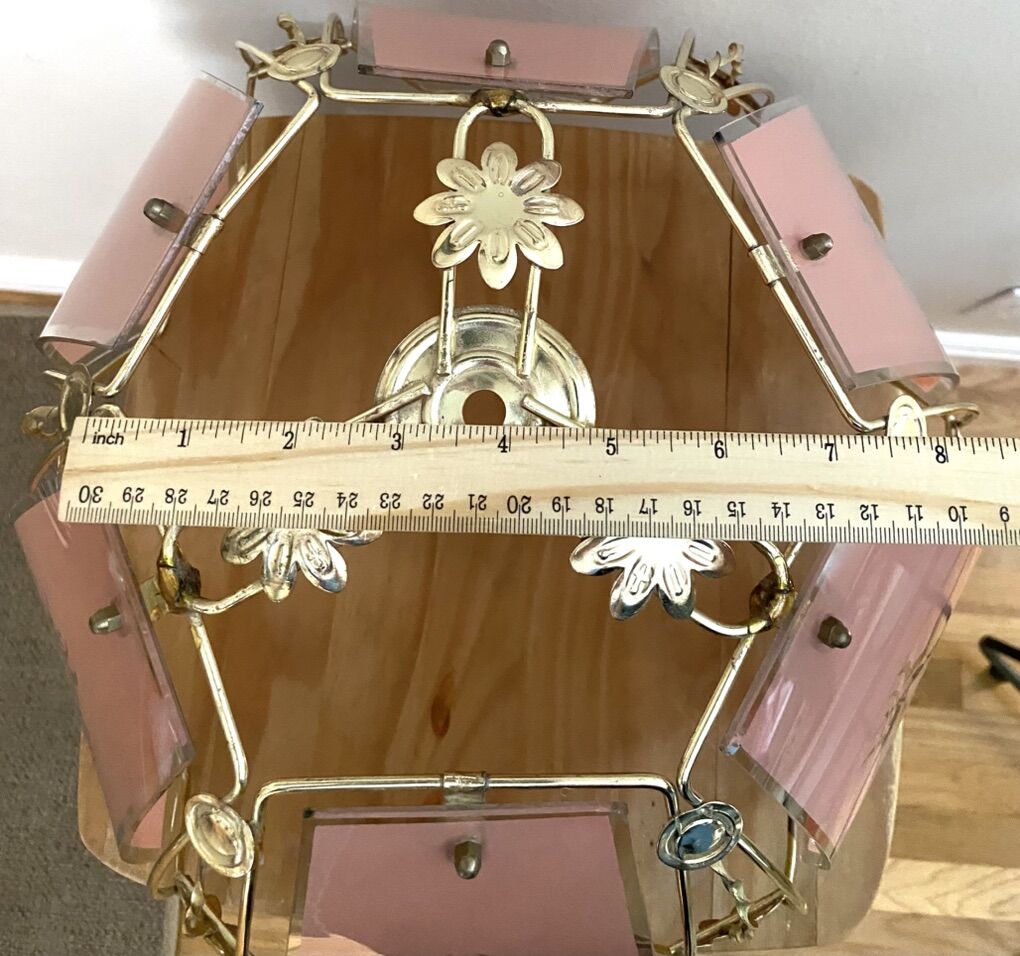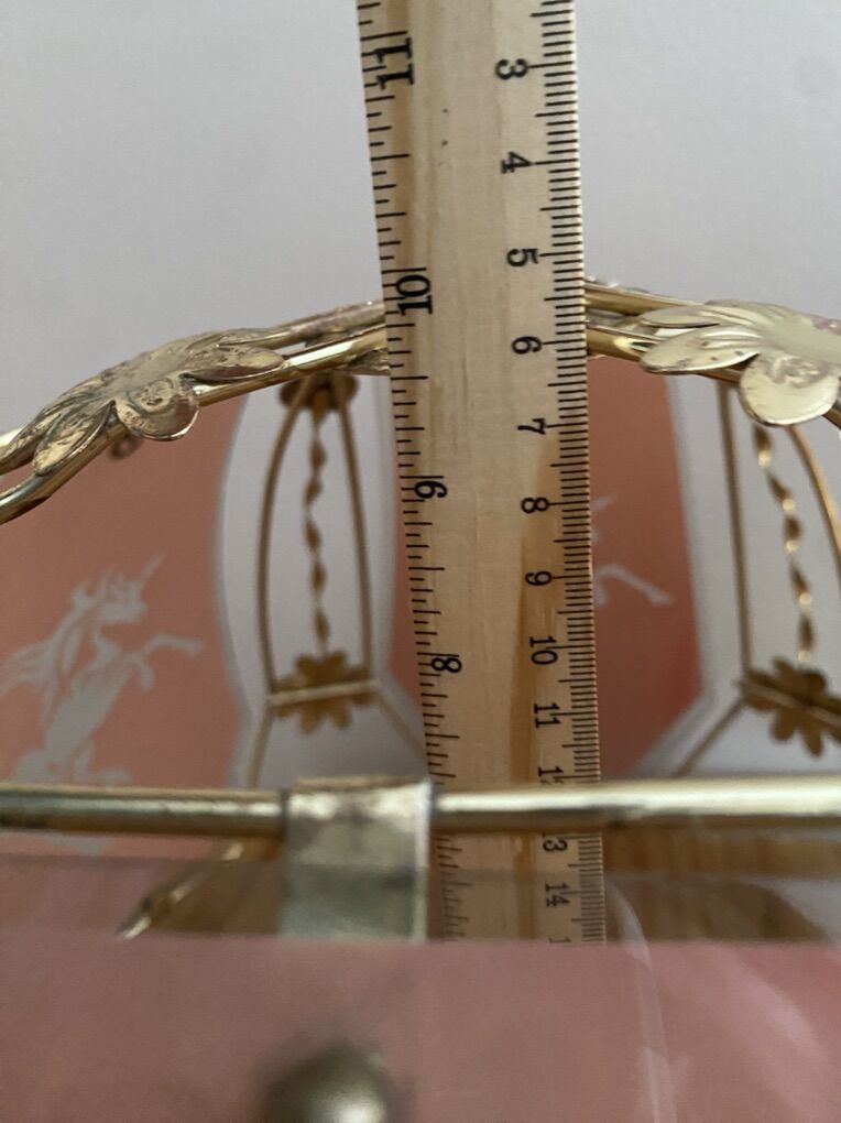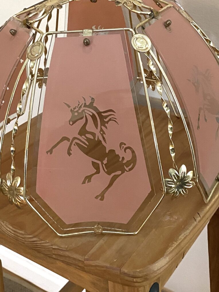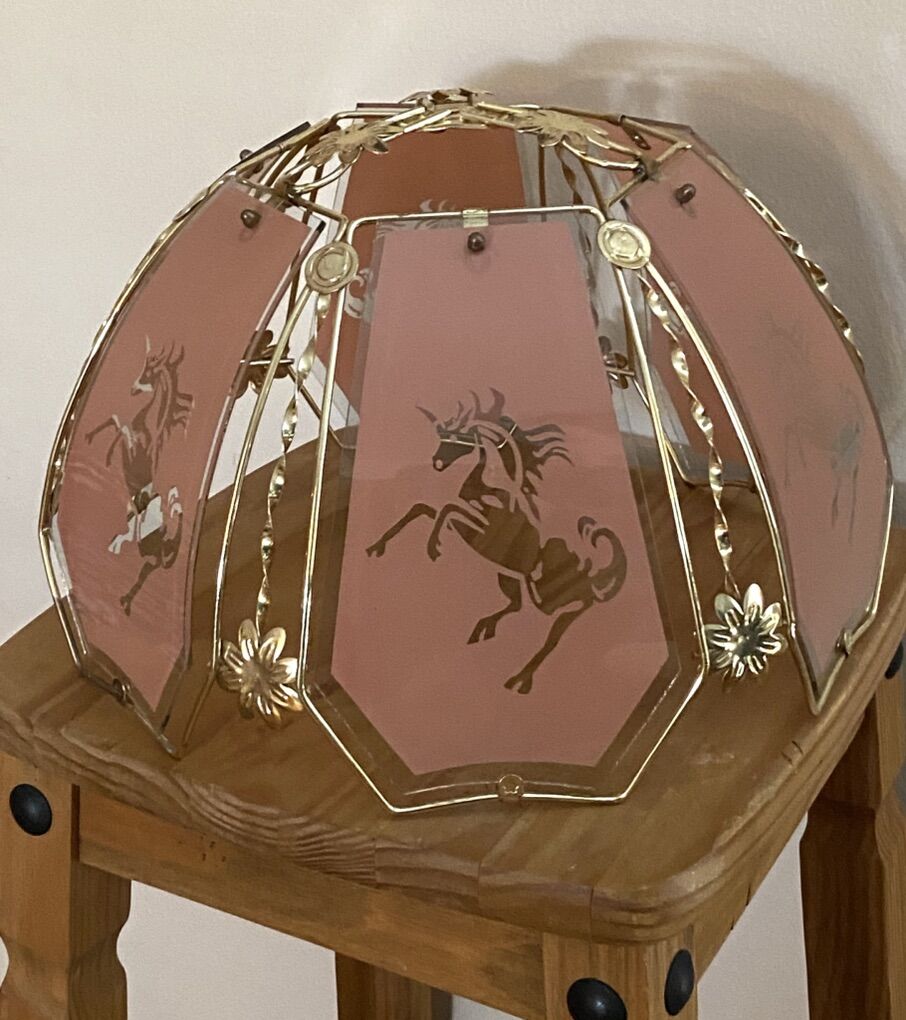 Vintage 1980's Unicorn Glass & Brass Lamp Shade / Light Pendant Very cool and mystical - Good vintage condition - Fragile. Few minor chips in glass. Pink/mauve color with clear unicorn. Approximate Measurements: Bottom of shade: 15 Top of shade: 7 1/4 Height: 10