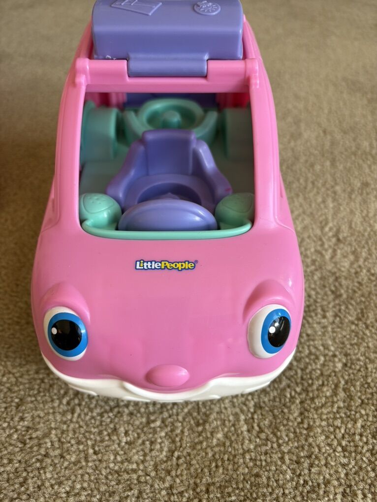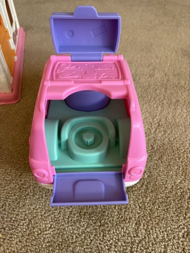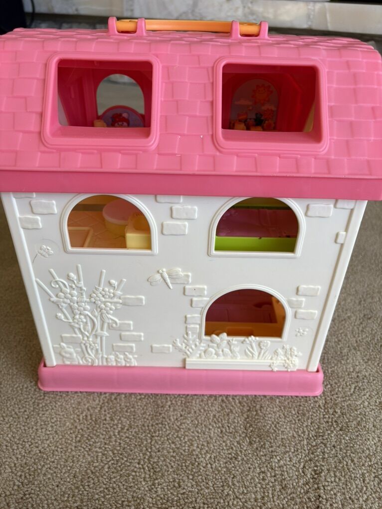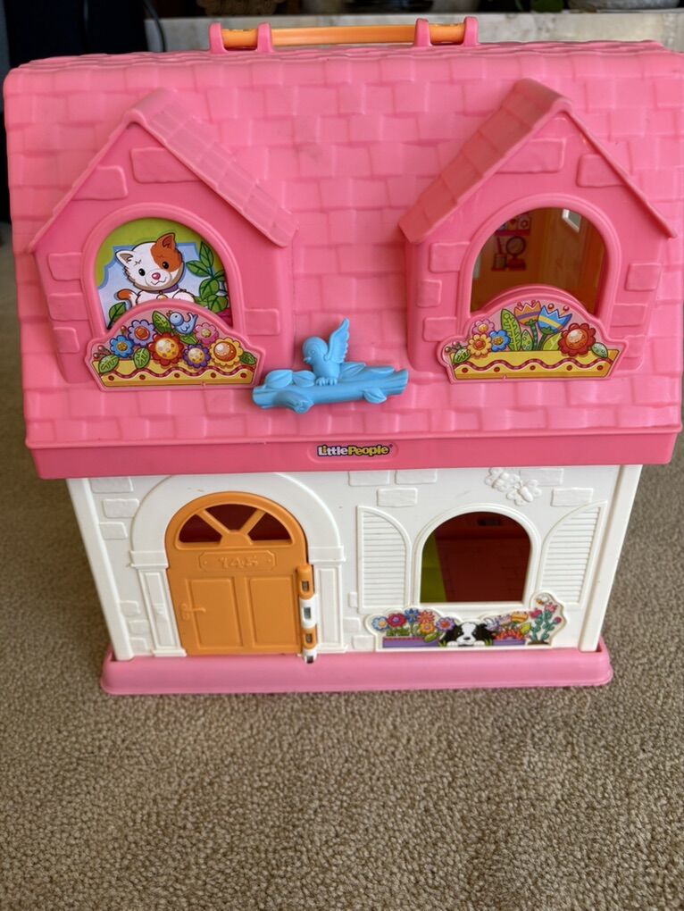 2015 Fisher-Price Little People Surprise & Sounds House set. Includes pink fold-up house with carrying handle, built-in furniture, and working sounds/music. Also includes extra furniture, bike, 5 people, dog, and family car. All in very good condition. Text only. Cash or Venmo.